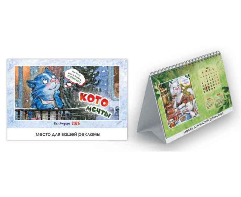 Календарь-домик настольный 200х115 мм, 12 листов + 2 обложки, мелованная бумага 115 гр/м2, разрезная сетка, курсор, пружина, подложка: картон одностороннего мелования 250 гр/м2, место для рекламы 200х25 мм., индивидуальная упаковка в пакет с еврослотом и клеевым клапаном. Яркий календарь с иллюстрациями всенародно любимых синих котов известной художницы Рины Зенюк. Обаятельные котики с удовольствием – и юмором! – делятся своими мыслями и секретами чудесного настроения!