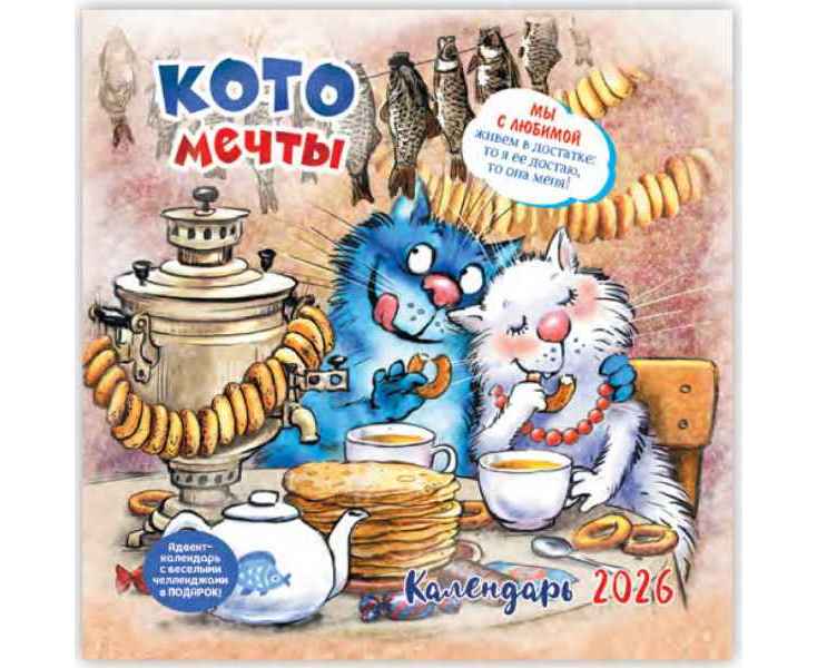 Календарь-органайзер настенный перекидной, 14 листов, мелованная бумага, блок 115 гр/м2, обложка 200 гр/м2, глянцевая ламинация, 4+4, крепление - скоба, индивидуальная упаковка в пакет с клеевым клапаном, с верхним еврослотом, вкладка из гофрокартона. Внутрь вложен адвент-календарь – отдельный лист со стирающимся слоем, под которым спрятаны задания для подготовки к Новому году на каждый день декабря, на задней обложке подарок-сюрприз: карманный календарь, который можно вырезать, размер в сложенном виде 290x290 мм, в развернутом виде 290х580 мм, возможно место для рекламы 290х70 мм. Яркий календарь-органайзер с иллюстрациями всенародно любимых синих котов известной художницы Рины Зенюк. Обаятельные котики с удовольствием – и юмором! – делятся своими мыслями и секретами чудесного настроения.