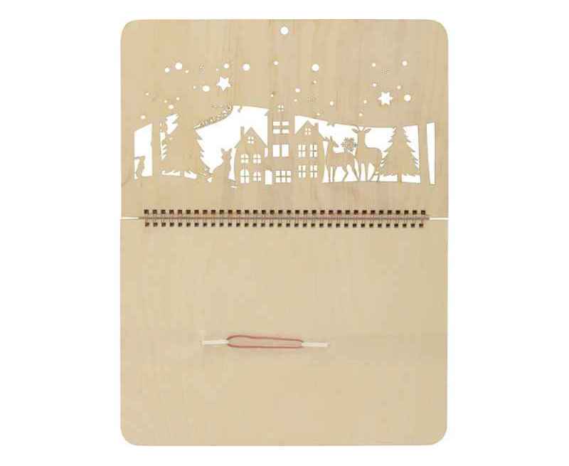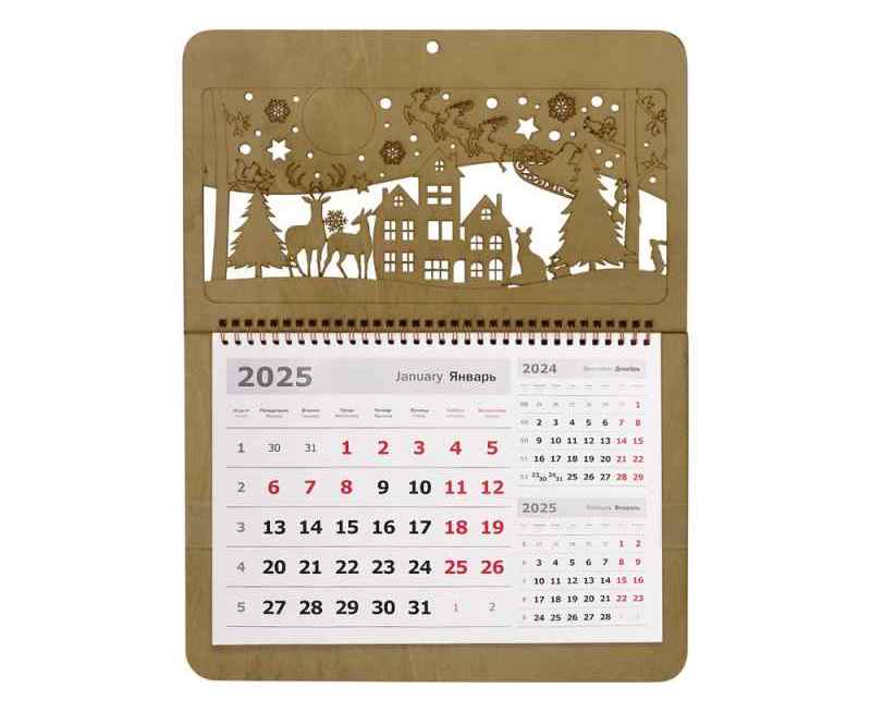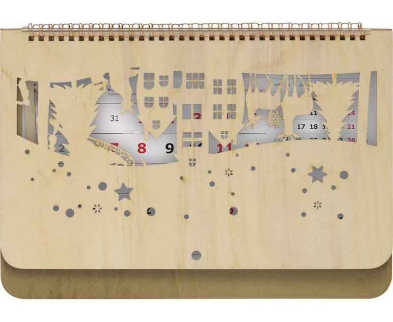 Настенный перекидной календарь имеет необычную обложку, в роли которой выступают фанерные крышки. Нижняя крышка сплошная, верхняя — резная, ажурная, с вырезанным новогодним пейзажем и большим полем под нанесение логотипа или надписи, которая органично впишется в облик календаря.