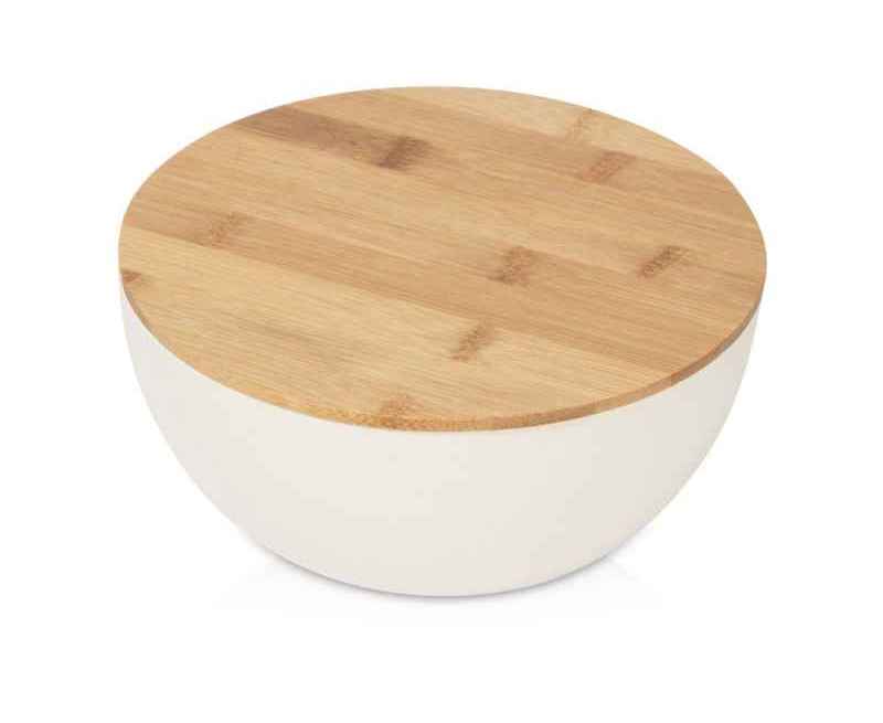 Круглый салатник с бамбуковой крышкой изготовлен на 80% из натуральных материалов. Он подходит для сервировки как лёгких салатов из свежих овощей, так и для более сытных и праздничных, а также фруктов или снеков. Наличие крышки удобно, когда накрыть на стол нужно немного заранее, например, до прихода гостей или на Новый год.