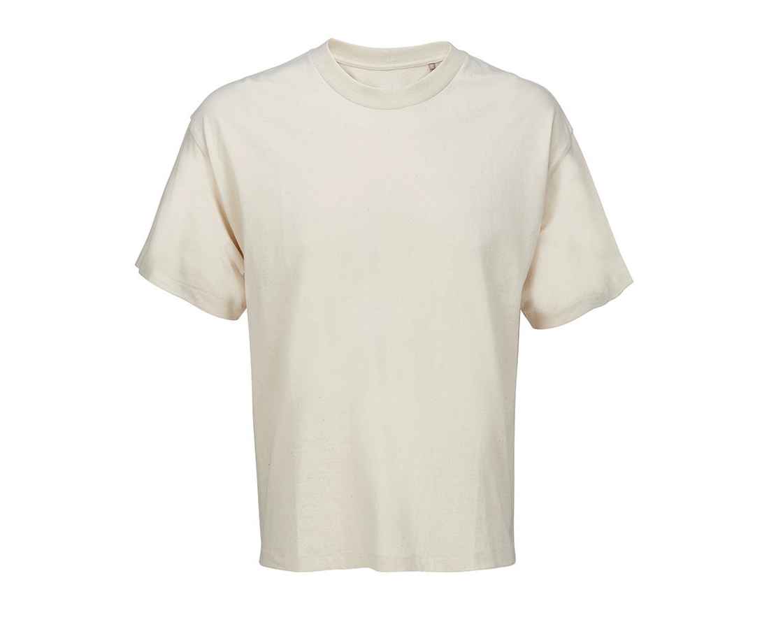 Футболка оверсайз унисекс с круглым вырезом, без боковых швов, высокой плотности. Выполнена из смеси переработанного хлопка (50%),и обычного хлопка (50%).,Укрепляющая тесьма по вороту. Усиленные плечевые швы. Круглый вырез отделан резинкой.