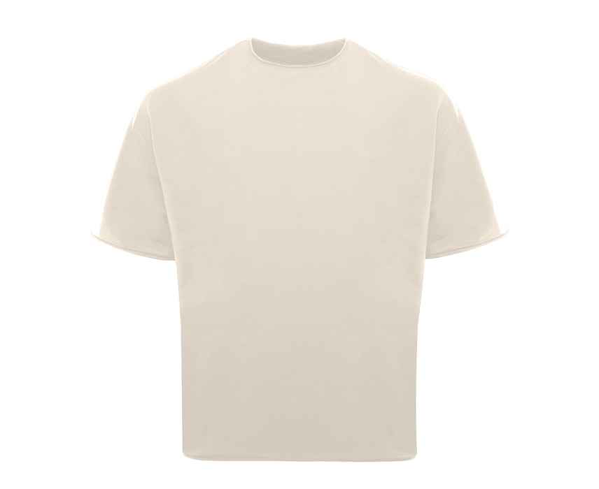 Футболка оверсайз-силуэта со спущенной линией плеча и необработанным краем рукава, горловины и по низу изделия.