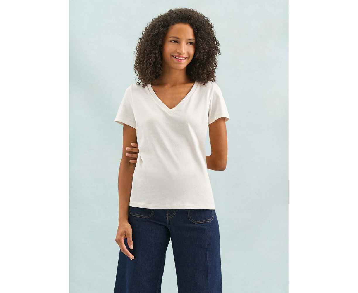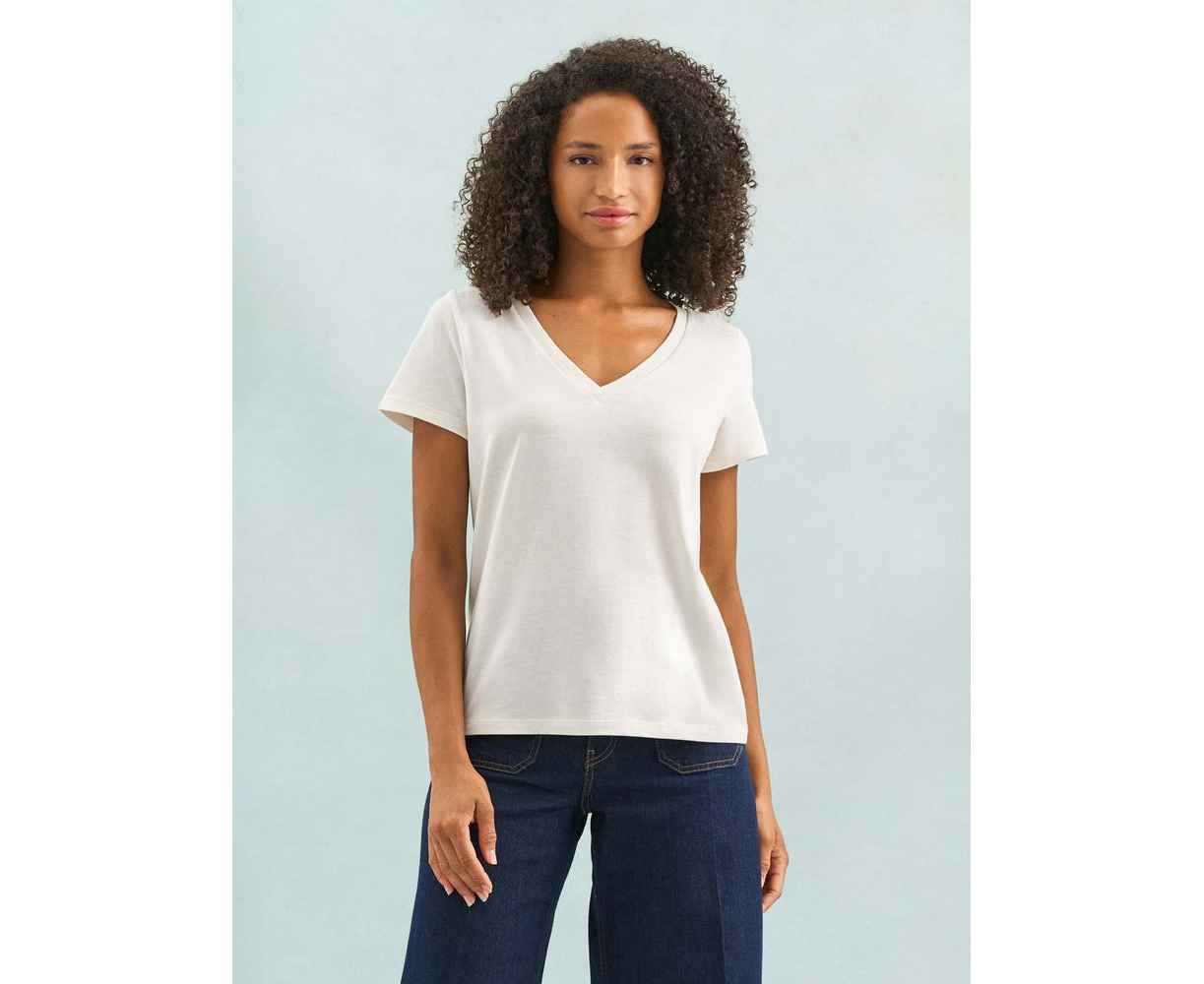 Женская футболка Regent с V-образным вырезом. Такой вырез снова актуален: он визуально удлиняет шею, подчеркивает линию ключиц и добавляет образу легкости.