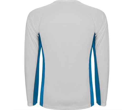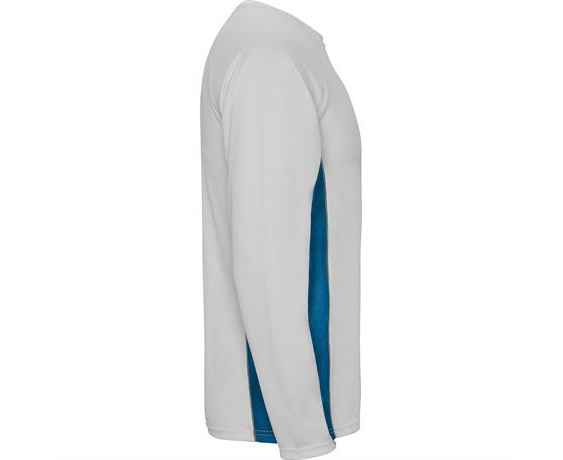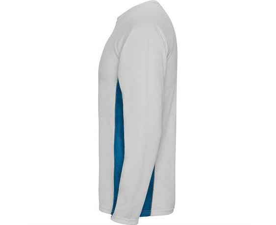 Спортивная футболка из двух комбинированных тканей из полиэстера. Длинные рукава реглан. Основная ткань — bird's eye, а боковые вставки и рукава с внутренней стороны — с микроперфорированной ткани. Круглая горловина с усиленными закрытыми внутренними швам