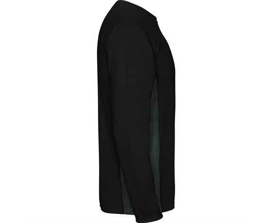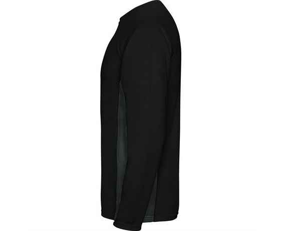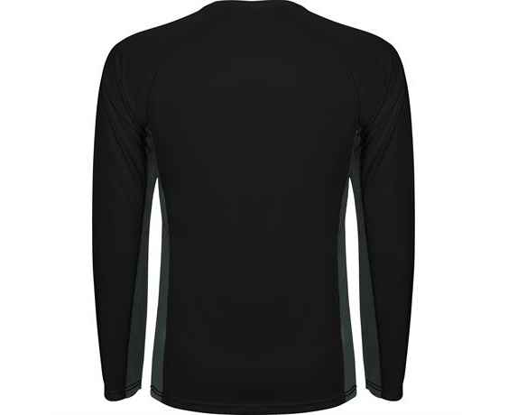 Спортивная футболка из двух комбинированных тканей из полиэстера. Длинные рукава реглан. Основная ткань — bird's eye, а боковые вставки и рукава с внутренней стороны — с микроперфорированной ткани. Круглая горловина с усиленными закрытыми внутренними швам