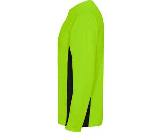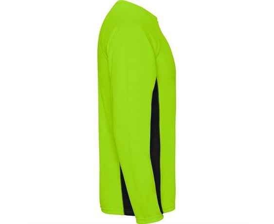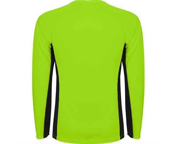 Спортивная футболка из двух комбинированных тканей из полиэстера. Длинные рукава реглан. Основная ткань — bird's eye, а боковые вставки и рукава с внутренней стороны — с микроперфорированной ткани. Круглая горловина с усиленными закрытыми внутренними швам