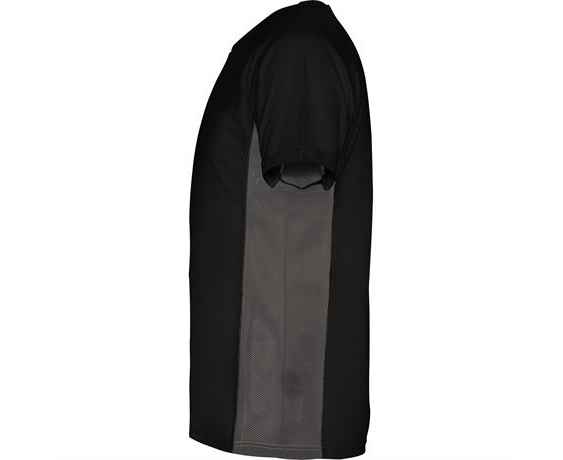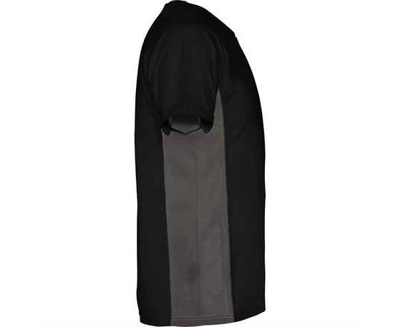 Спортивная футболка с короткими рукавами реглан, изготовленная из двух комбинированных тканей из полиэстера. Основная ткань — ткань bird's eye, а боковые вставки и рукав с внутренней стороны — с микроперфорированной ткани. Круглая горловина с усиленными