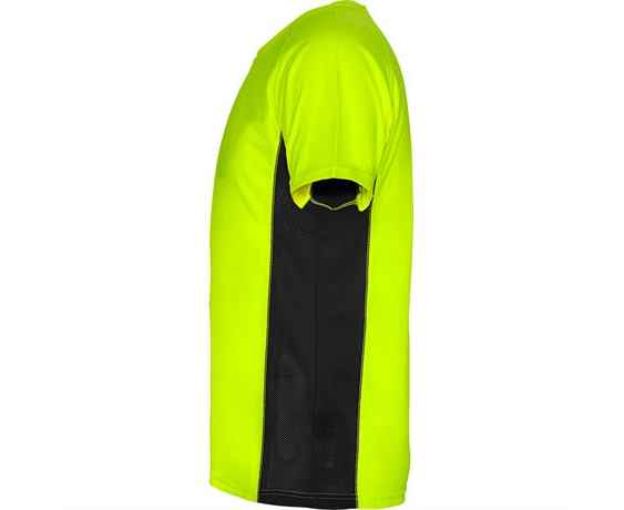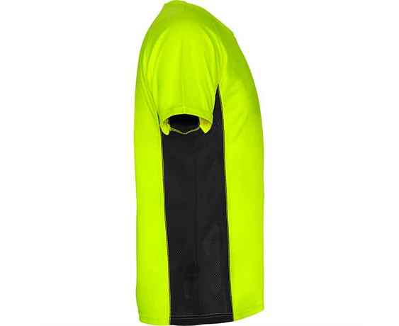 Спортивная футболка с короткими рукавами реглан, изготовленная из двух комбинированных тканей из полиэстера. Основная ткань — ткань bird's eye, а боковые вставки и рукав с внутренней стороны — с микроперфорированной ткани. Круглая горловина с усиленными