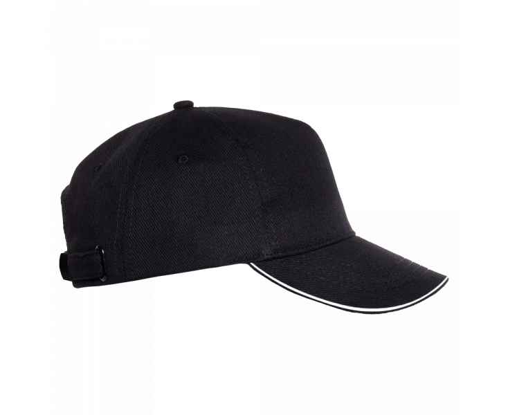 Пятиклиновый пошив, отсутствие лобового шва и изогнутый жесткий козырек «сэндвич» с контрастным кантом. Посадка регулируется ремешком с металлической застежкой.