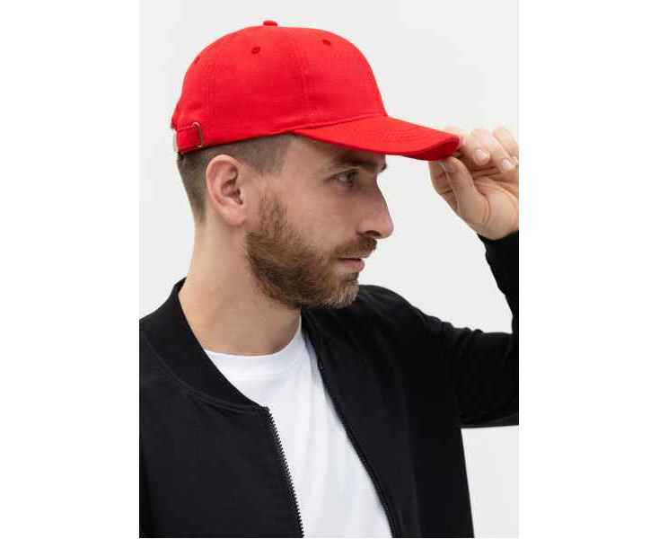 Бейсболка-шестиклинка с изогнутым жестким козырьком, прилегание регулируется ремешком с металлической застежкой.