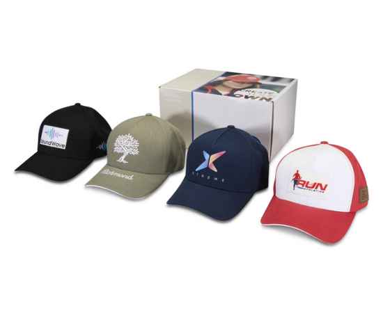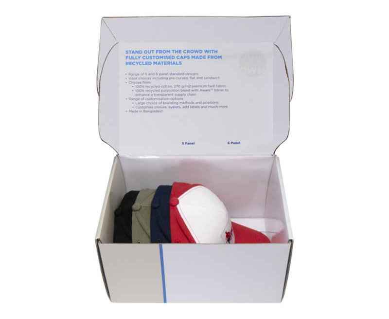 Коробка с образцами 4 бейсболок разных стилей: 1 Boston бейсболка из переработанного хлопка с 5 панелями, 1 Houston бейсболка из переработанного хлопка с 6 панелями, 1 Arizona бейсболка из переработанного хлопка с 5 панелями и многослойным козырьком и 1 Richmond Aware™ бейсболка из переработанного хлопка с 6 панелями и многослойным козырьком. Картон.