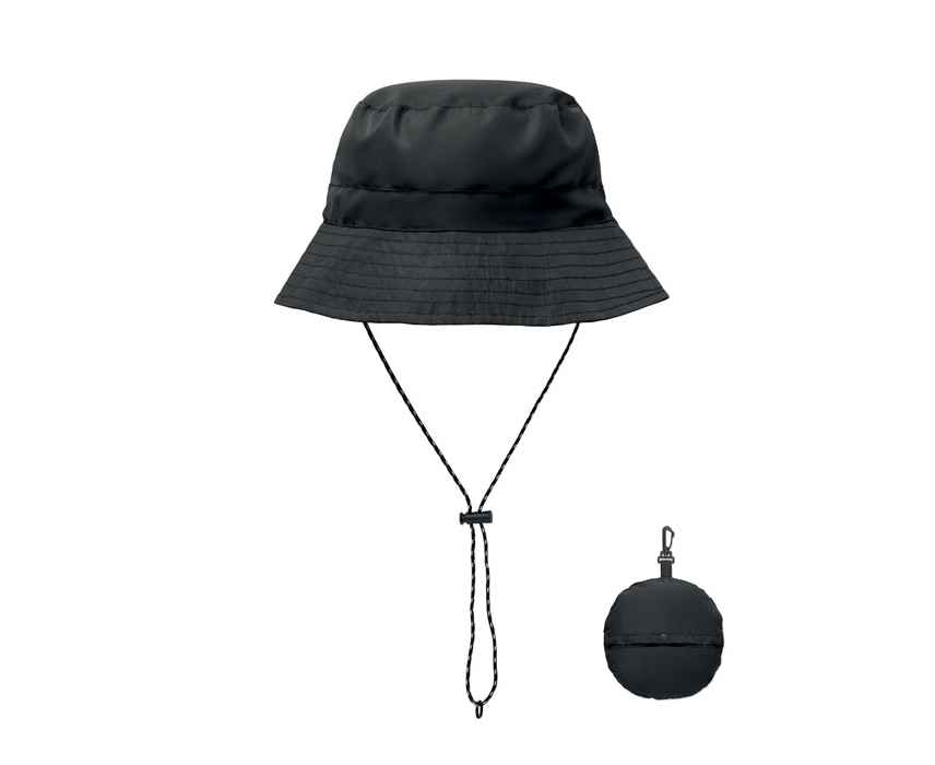 Шляпа рыбака из водоотталкивающего полиэстера, в комплекте чехол из того же материала с пластиковым карабином. 64 г/м².
