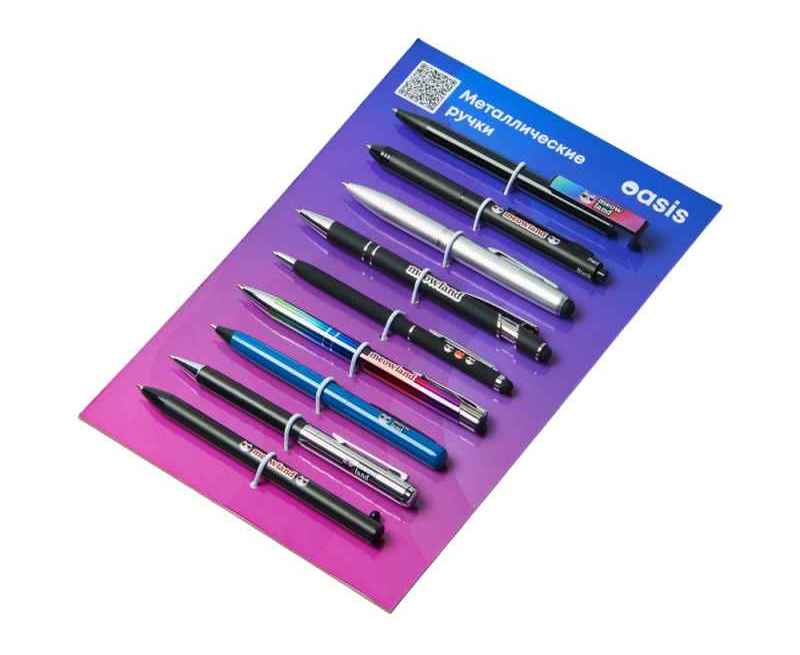 Промо-сет ручек — ваш готовый демонстрационный комплект, включающий 9 моделей металлических ручек с примерами нанесения: гравировка, тампопечать и УФ-печать.