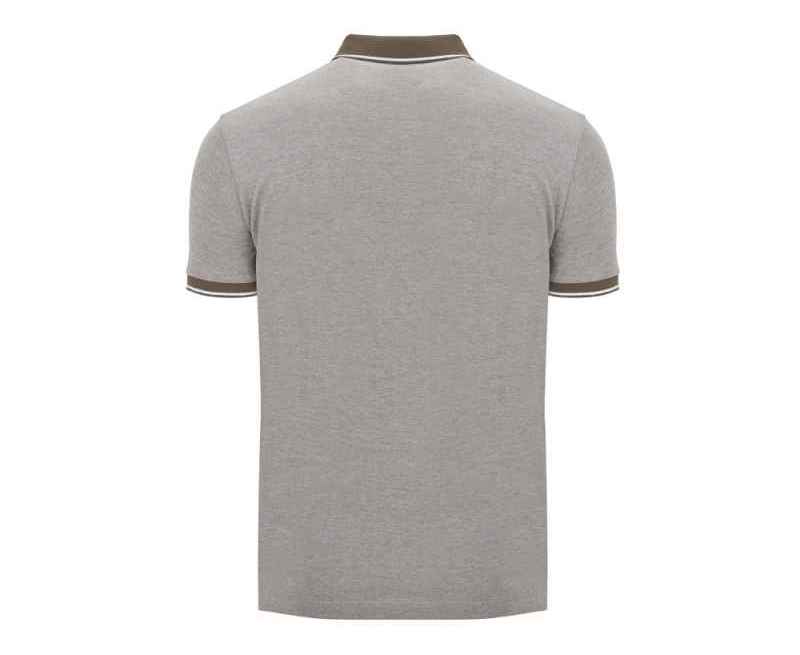 Рубашка поло с коротким рукавом. Манжеты и воротник из однотонного риба 1х1 с контрастными полосками. Планка на 3 пуговицы. Низ с боковыми разрезами, отделанными тесьмой. Спинка немного длиннее полочки. Полотно с меланжевым эффектом.