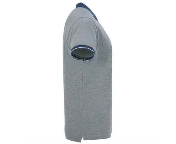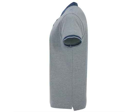 Футболка поло меланжевого цвета с короткими рукавами. Воротник и манжеты рукавов однотонного цвета в рубчик 1 x 1 с контрастной декоративной полосой. Внутренняя планка с декоративной контрастной лентой на три пуговицы. Вырез внизу по бокам с усиленными шв