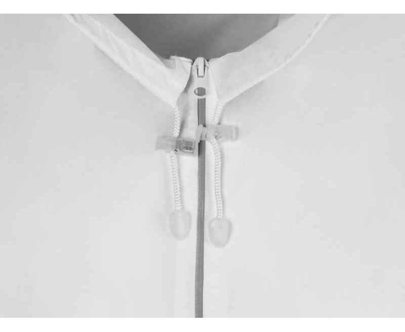 Капюшон и низ дождевика затягиваются на шнурки с фиксаторами, что позволяет отрегулировать посадку по фигуре. Манжеты дождевика — на резинке.