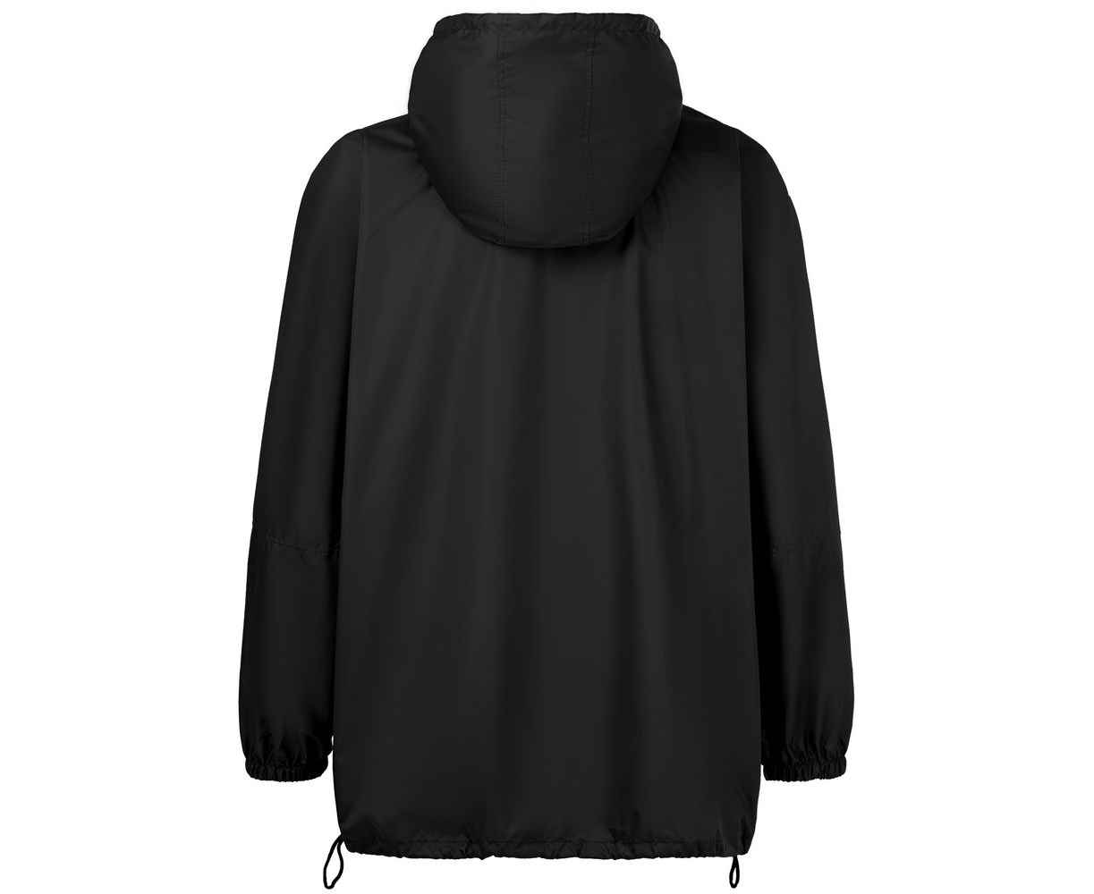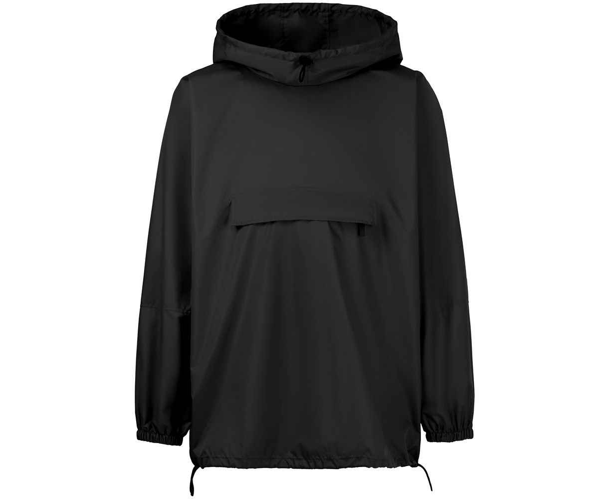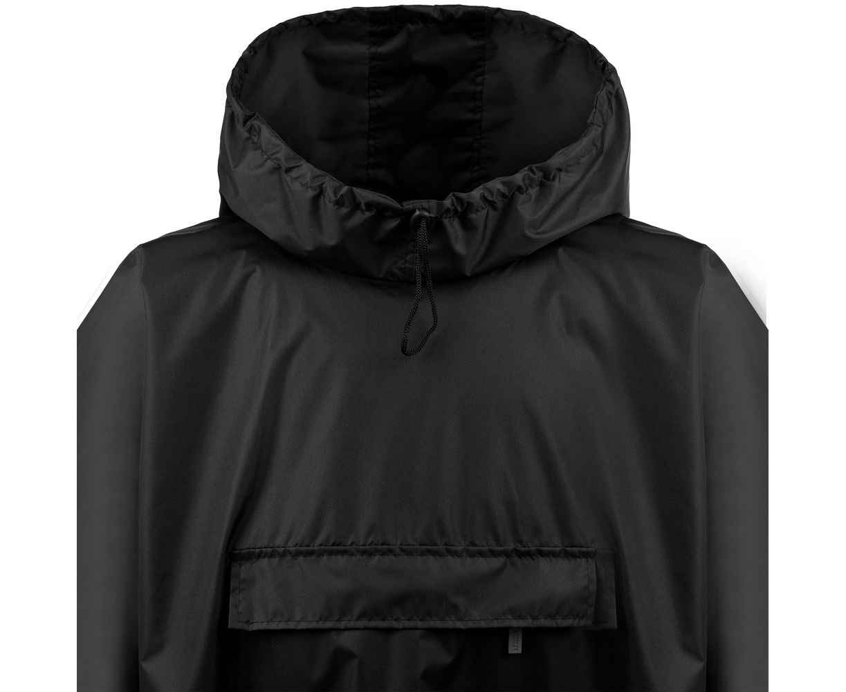 Дождевик-анорак с капюшоном и карманом на молнии спереди. Выполнен из ткани дюспо с матовой поверхностью — легкой, мягкой на ощупь, но устойчивой к повреждениям. Она не шелестит и практически не мнется. Благодаря пропитке дюспо обладает отличными водоотталкивающими и ветрозащитными свойствами.