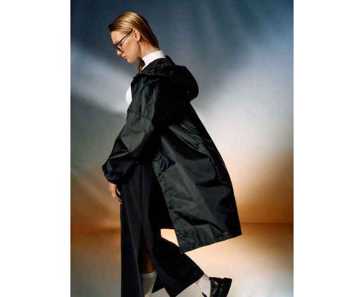 Плащ-дождевик из ткани таффета на кнопках с капюшоном.