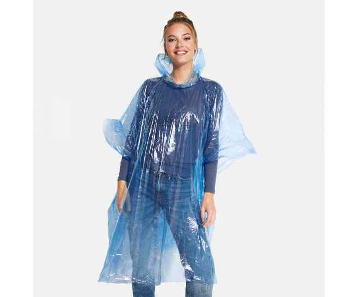 Одноразмерный прозрачный дождевик для взрослых с капюшоном и отверстиями для рук. Поставляется в мешочке из LDPE размером 10 x 13,5 см.