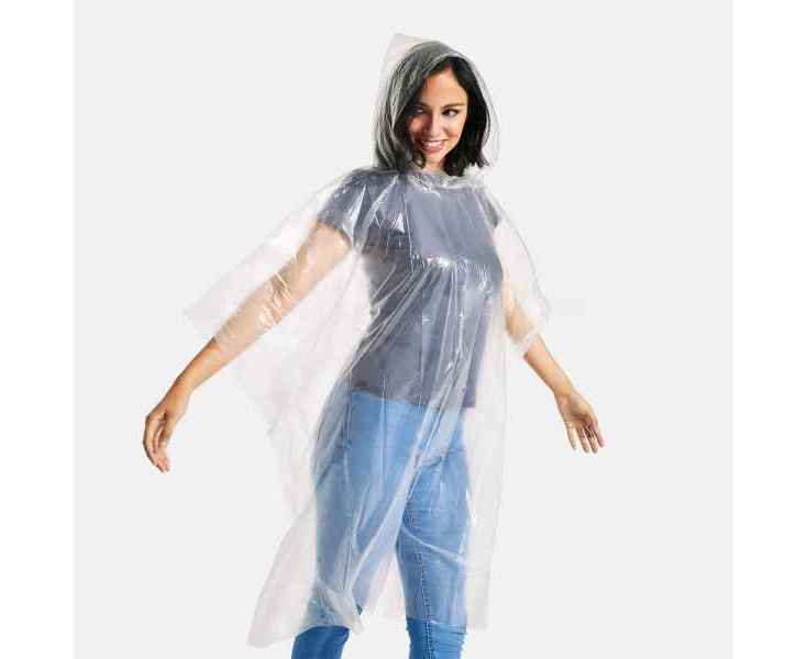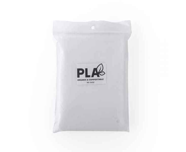 Прозрачный дождевик из компостируемого материала. Один размер для взрослых с капюшоном и отверстиями для рук. Поставляется в мешочке из PLA 10 x 13,5 см.