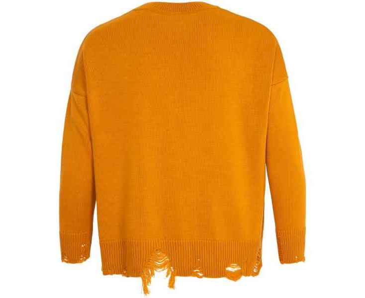 Модель: однотонный гладкий свитер унисекс, спущенное плечо. Ворот, манжеты и низ изделия вывязаны резинкой c добавлением эффекта «рваного» края.