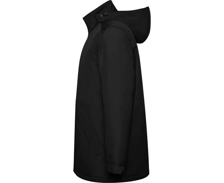 Водонепроницаемая куртка-парка с мягкой подкладкой. Высокий воротник со складным капюшоном и застежкой-липучкой. Центральная застежка-молния с клапанами. Боковые карманы на застежке-молнии с фиксированным клапаном. Внутренний карман с застежкой-липучкой. Регулируемые манжеты с петлей для ремня на липучке. Внутренний доступ для персонализации и декорирования на левой стороне груди и спине.
