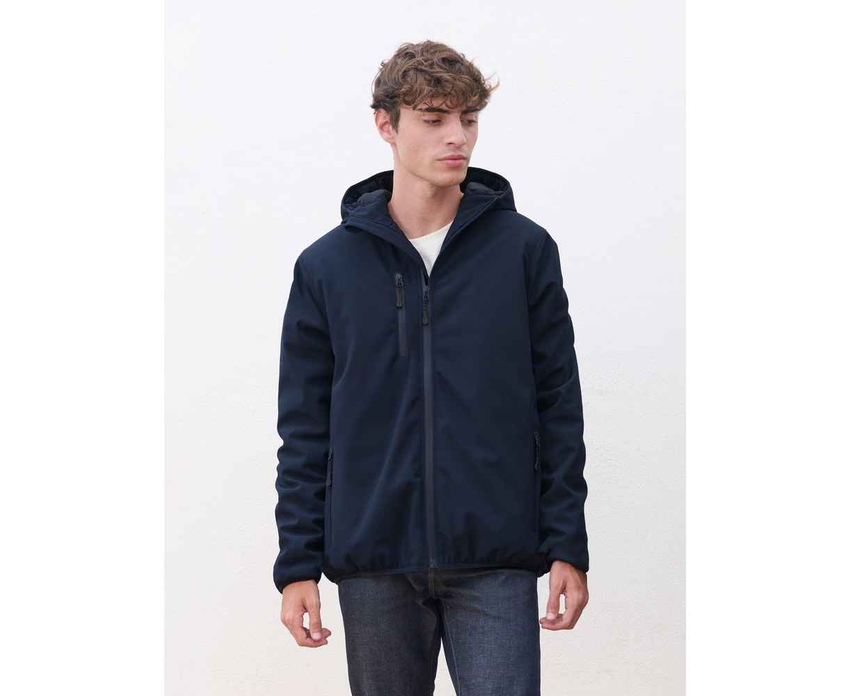 Мужская куртка софтшелл на молнии и с капюшоном.