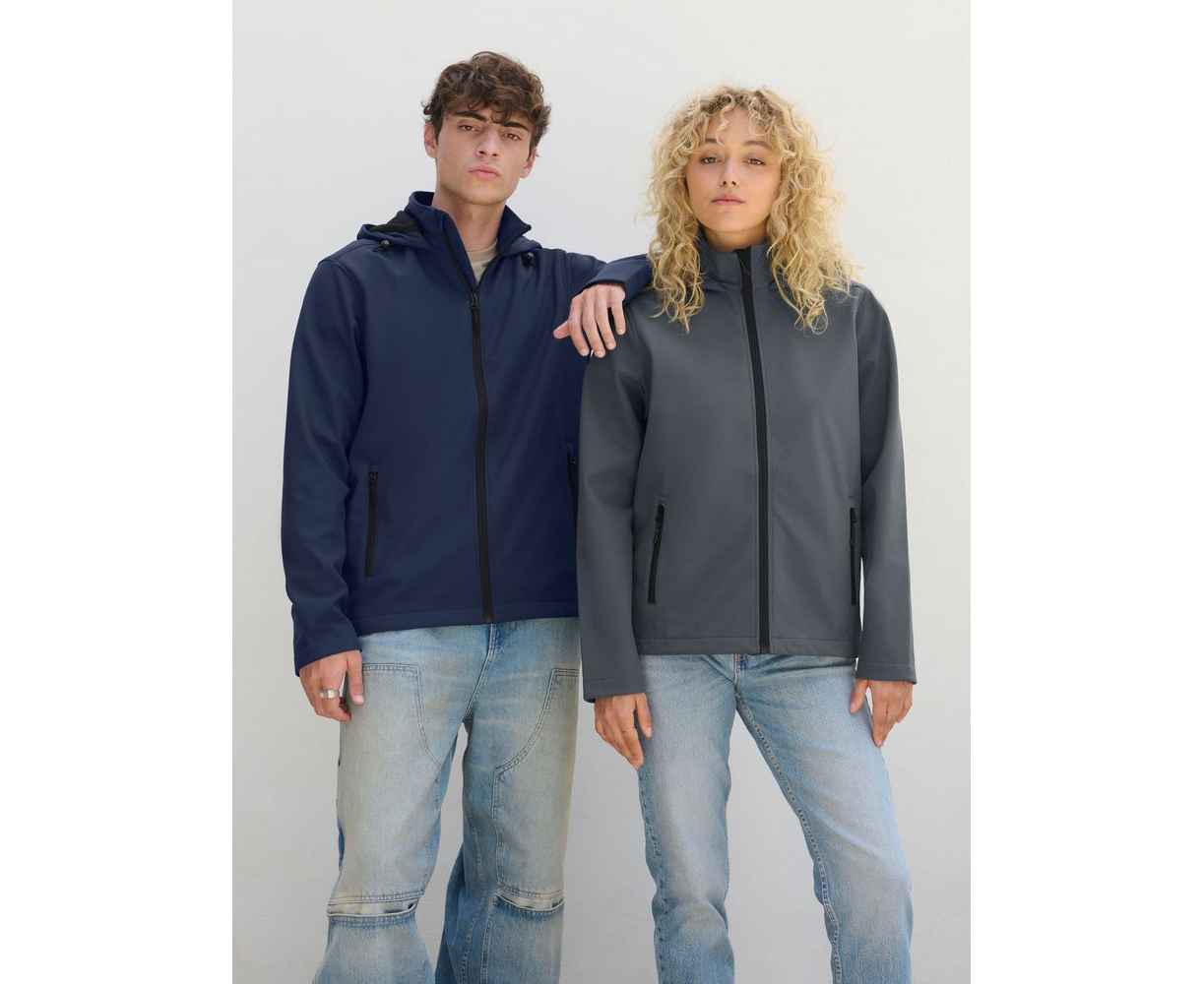 Мужская куртка софтшелл на молнии и с капюшоном.