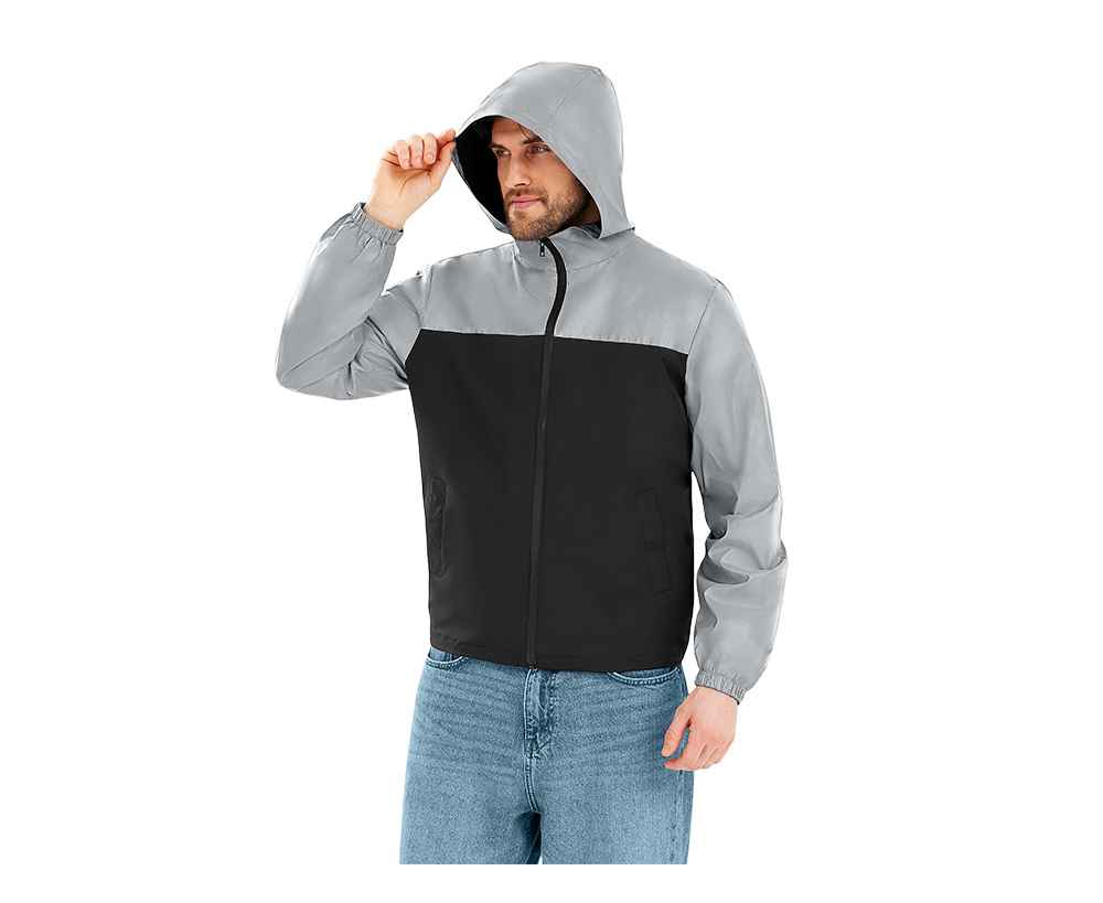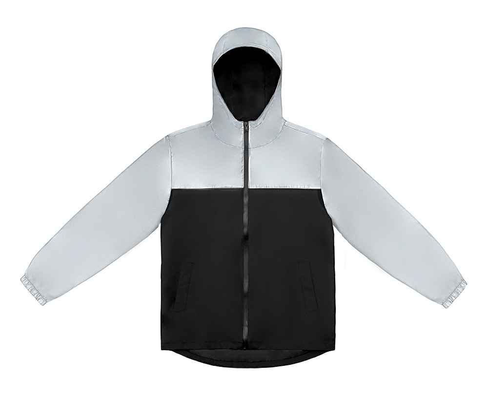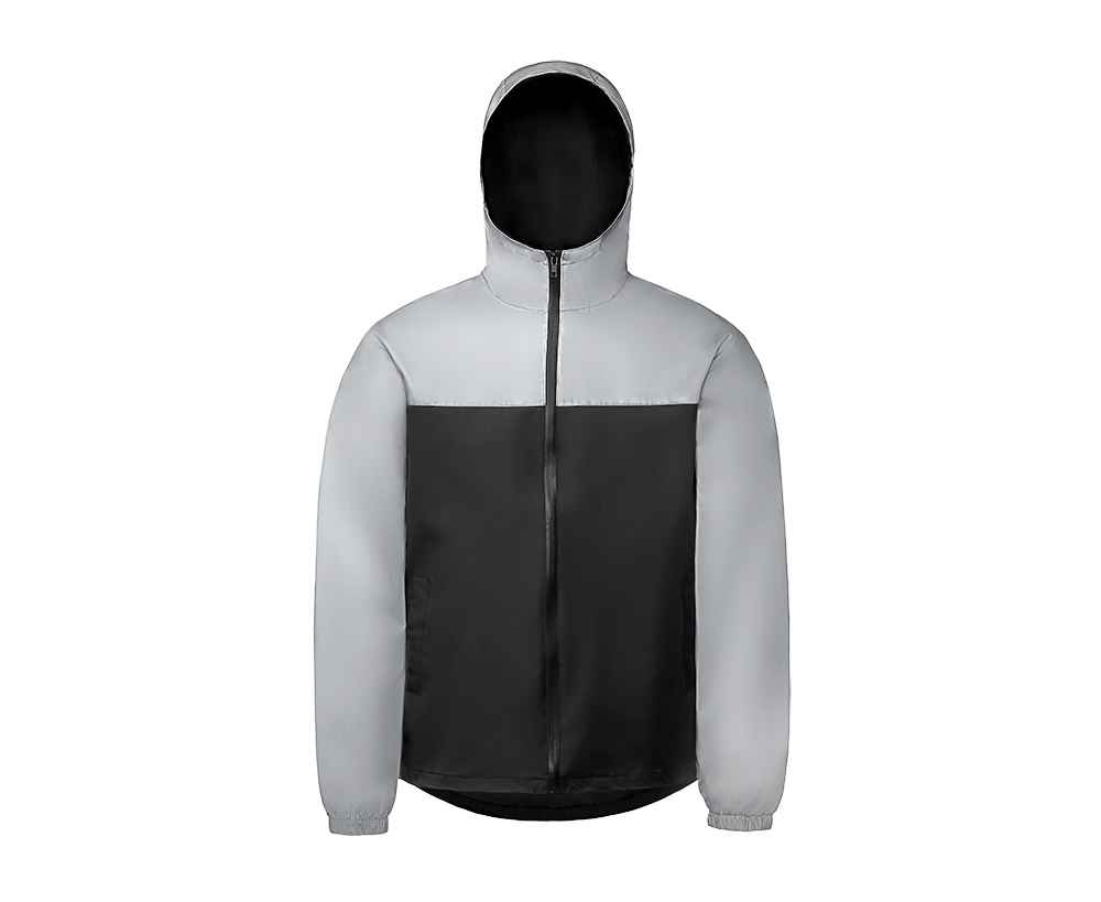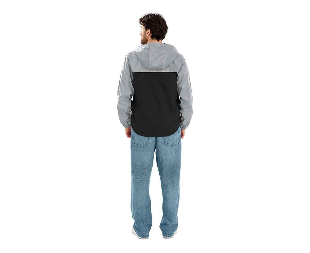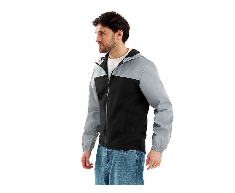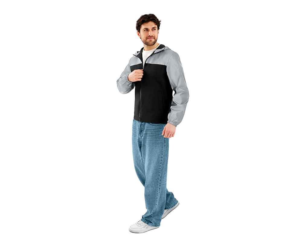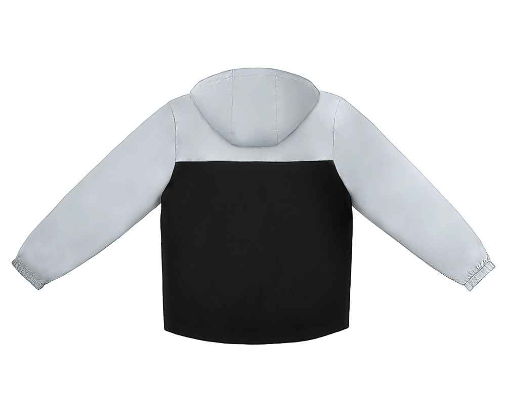 Streetwear-ветровка с контрастным дизайном: верх переда и спинки, рукава и капюшон — из светоотражающей ткани, низ — из прочной чёрной полиэстеровой ткани. Модель на подкладке, со спинкой длиннее переда.