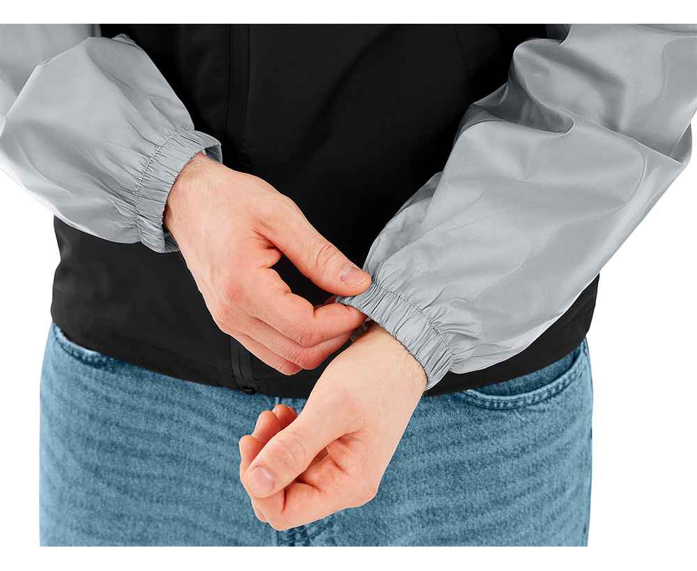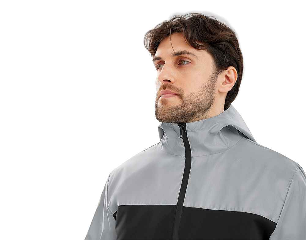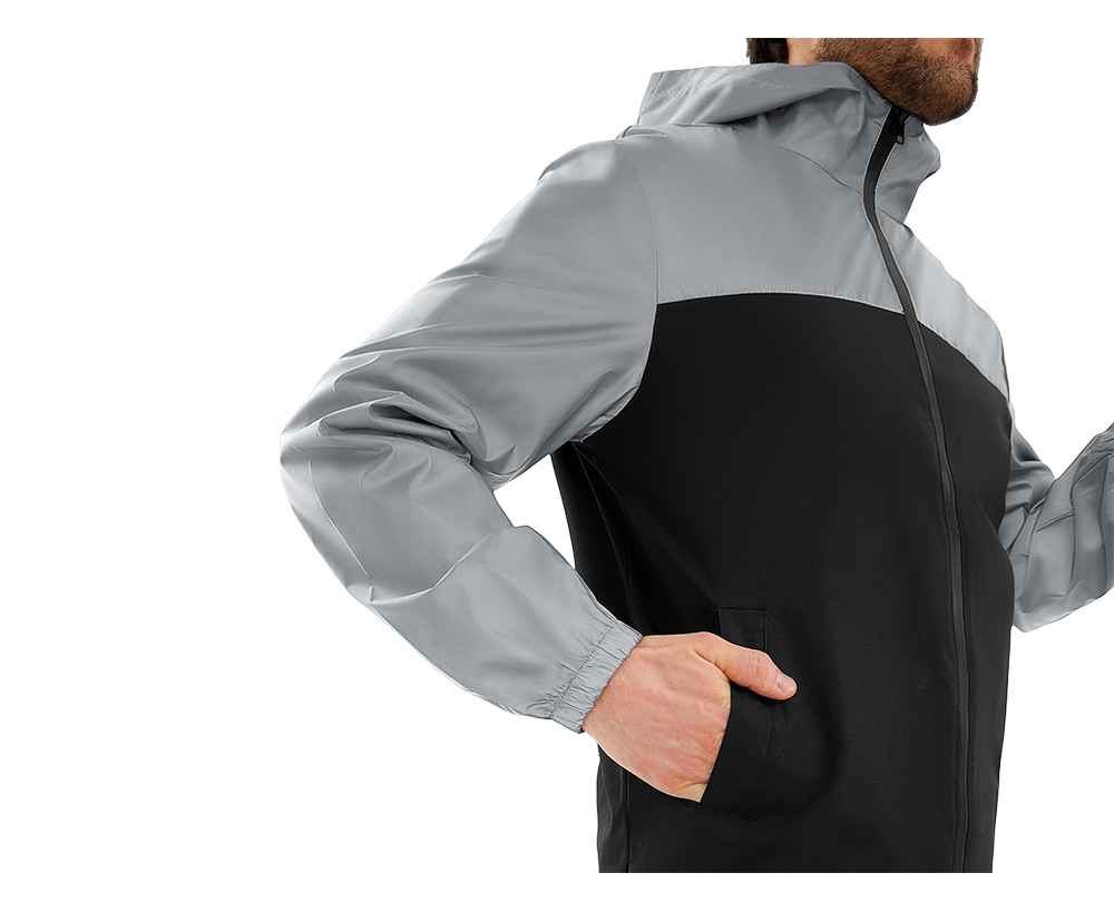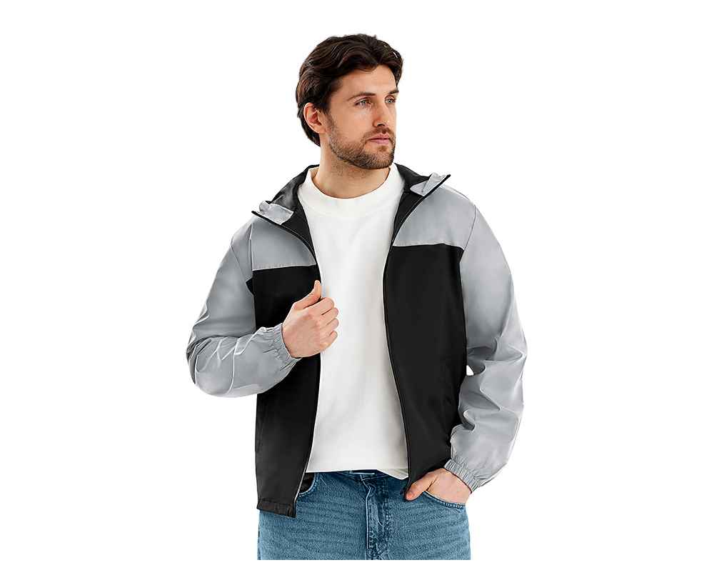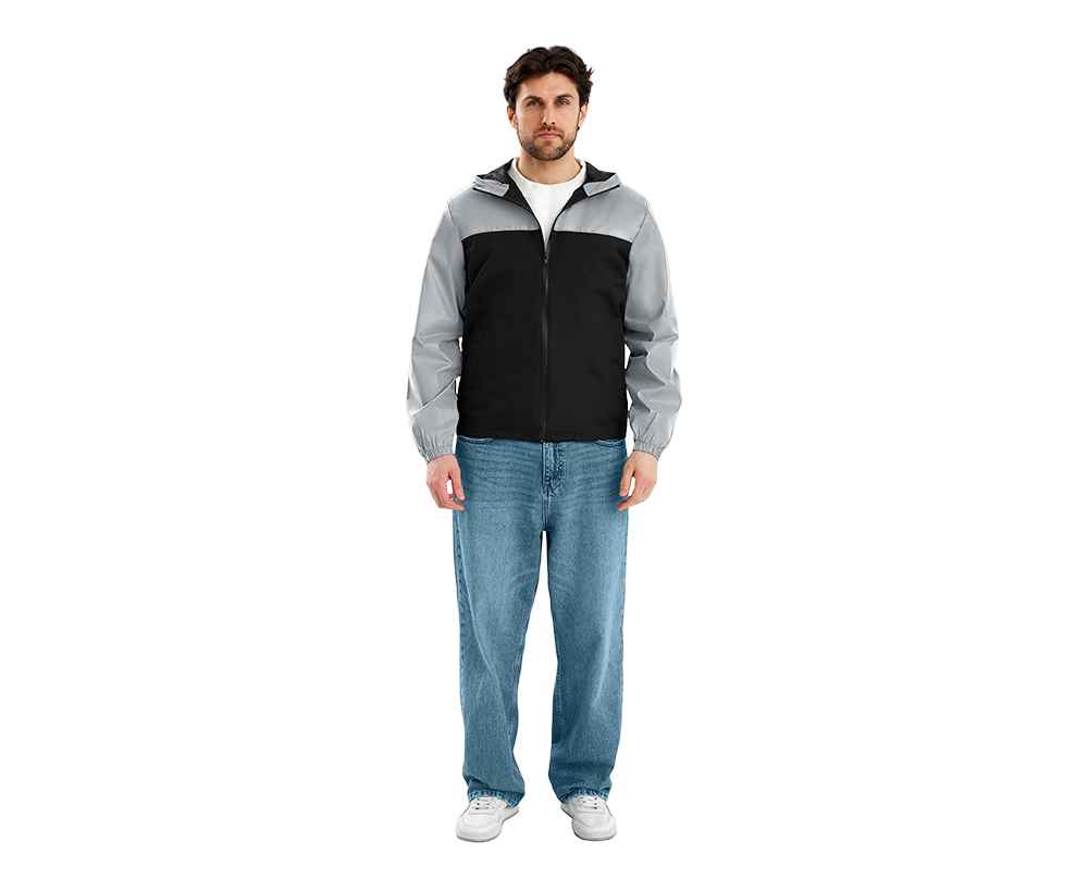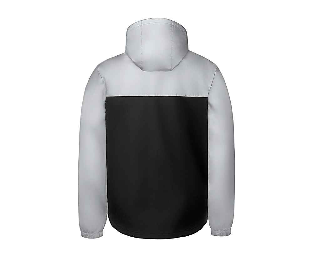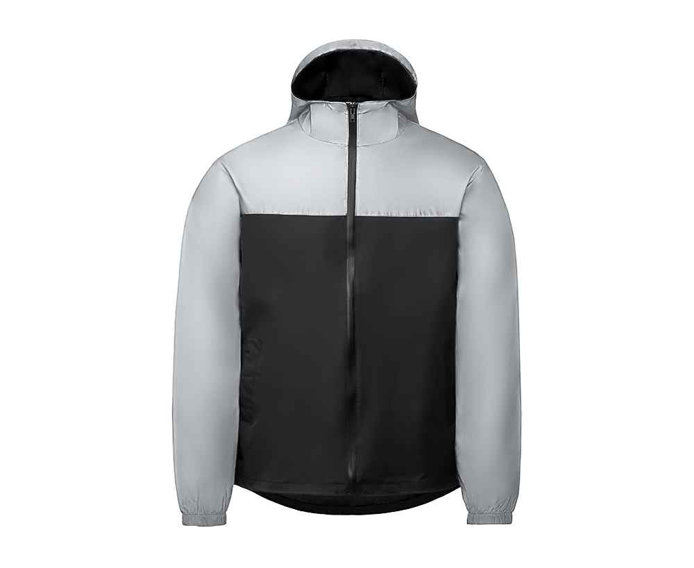 Streetwear-ветровка с контрастным дизайном: верх переда и спинки, рукава и капюшон — из светоотражающей ткани, низ — из прочной чёрной полиэстеровой ткани. Модель на подкладке, со спинкой длиннее переда.