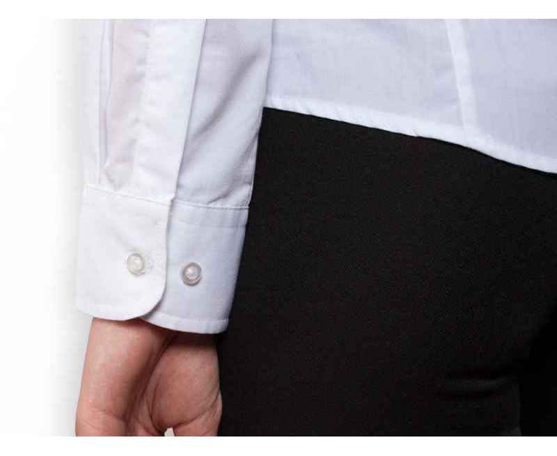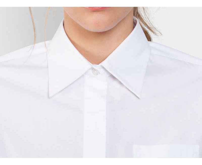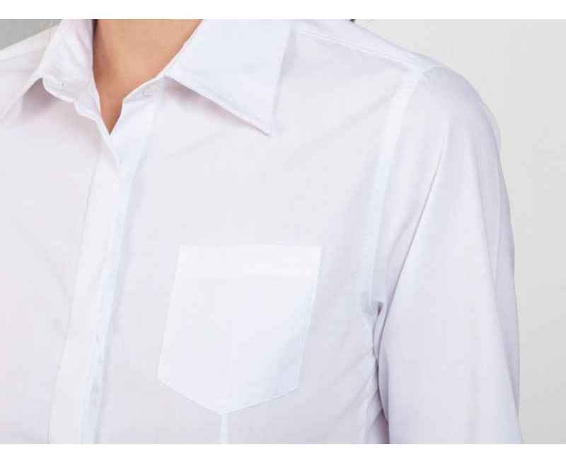Рубашка женская прилегающего силуэта с длинным рукавом, вытачки на полочке и спинке. Накладной карман на груди слева, закругленный низ изделия. Планка с потайными пуговицами.