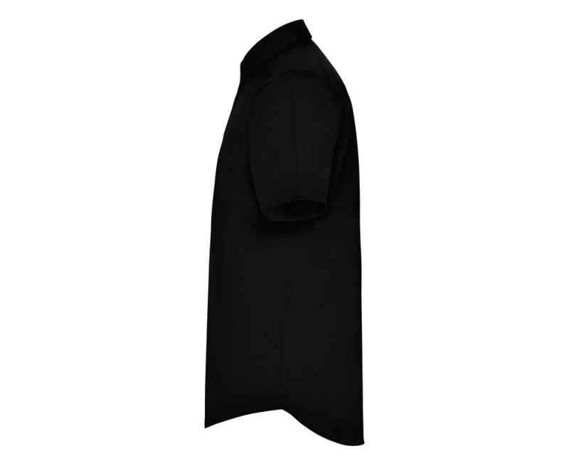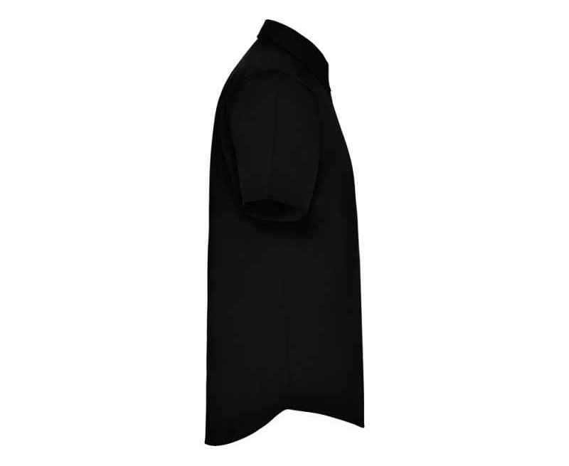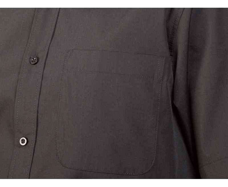 Рубашка мужская с коротким рукавом на семи пуговицах. Накладной карман на груди слева, закругленный низ изделия. Уголки воротника продублированы пуговицами.