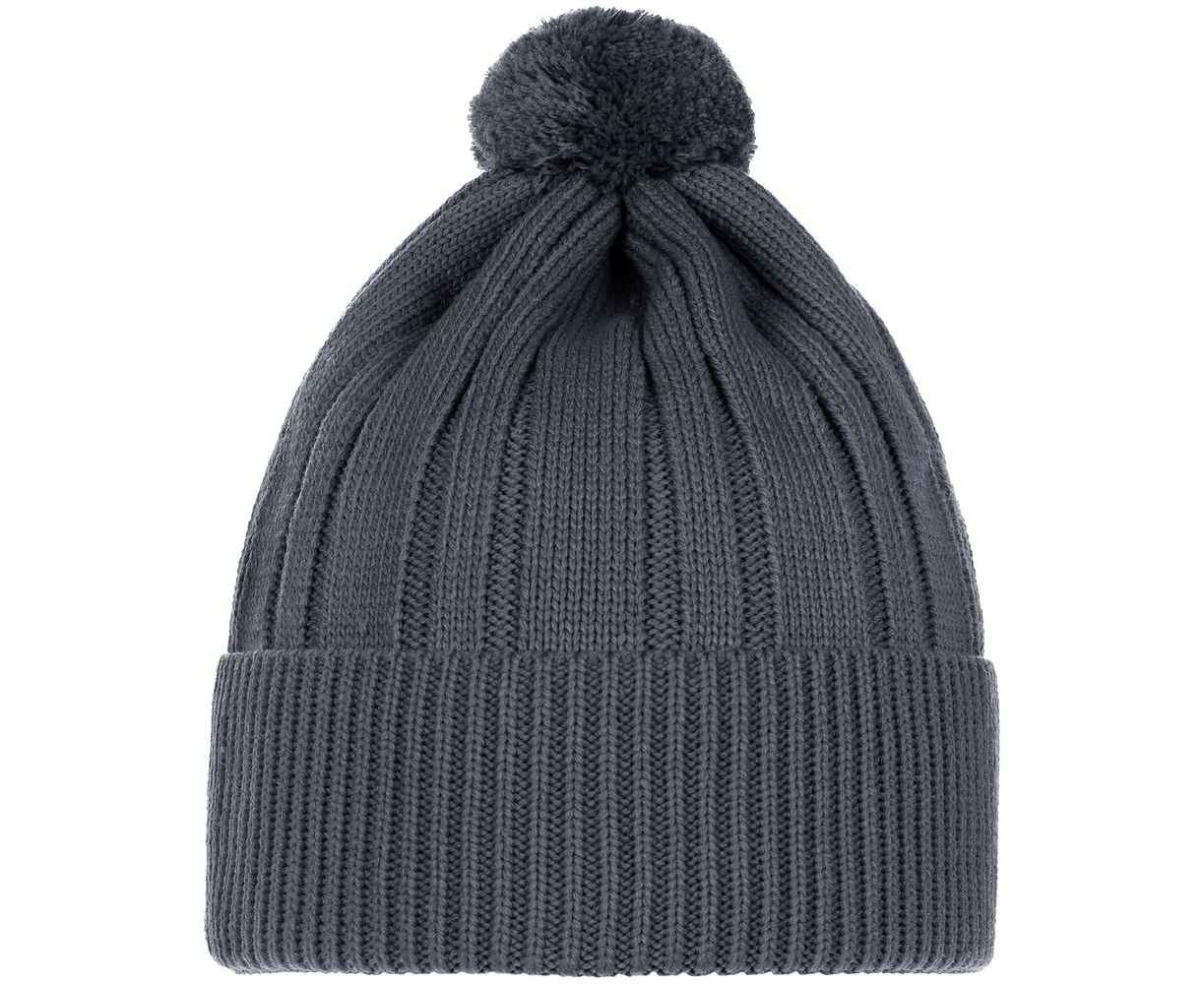 Однослойная шапка фактурной вязки с помпоном и широким отворотом.