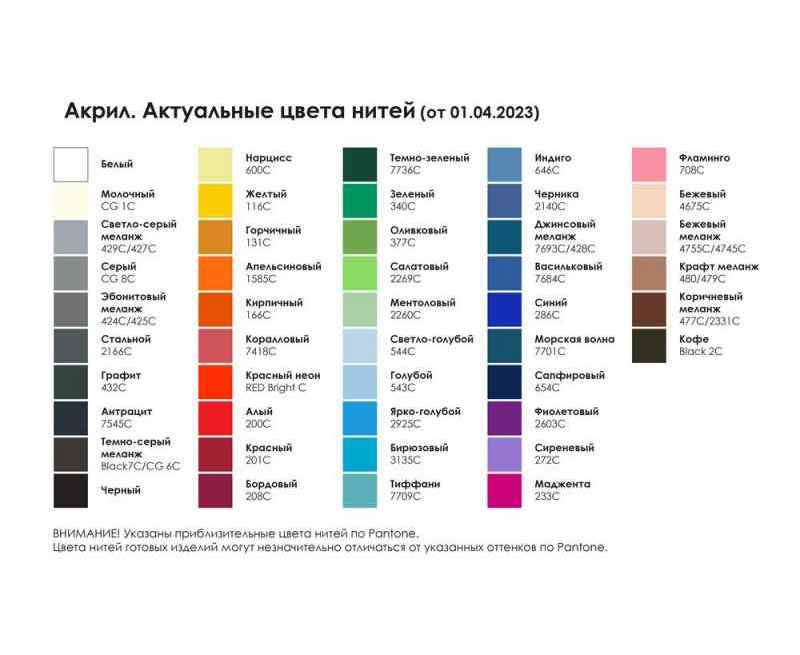 Цвет: выберите цветовое решение по таблице «Актуальные цвета нитей» (на фото).