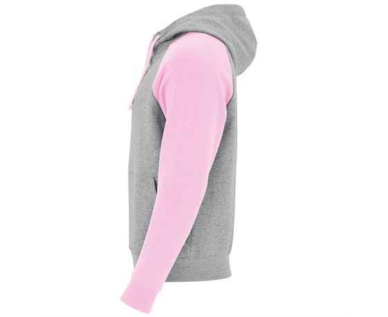 Двухцветное Толстовка унисекс. Капюшон с запахом спереди на горловине, металлическими люверсами и контрастной внутренней частью и шнурками. Контрастные рукава реглан. Карман-кенгуру. Манжеты и низ в рубчик 1 x 1 с эластаном.* Съемная этикетка.