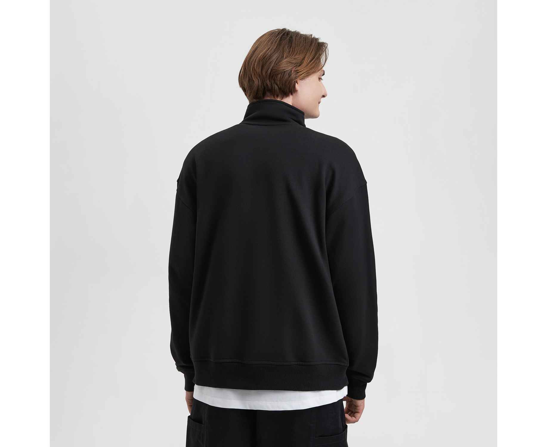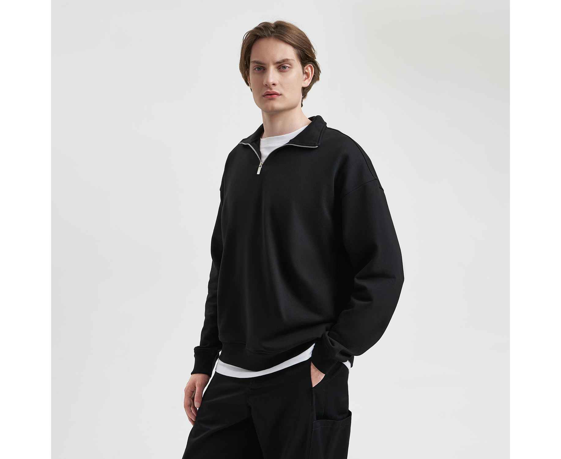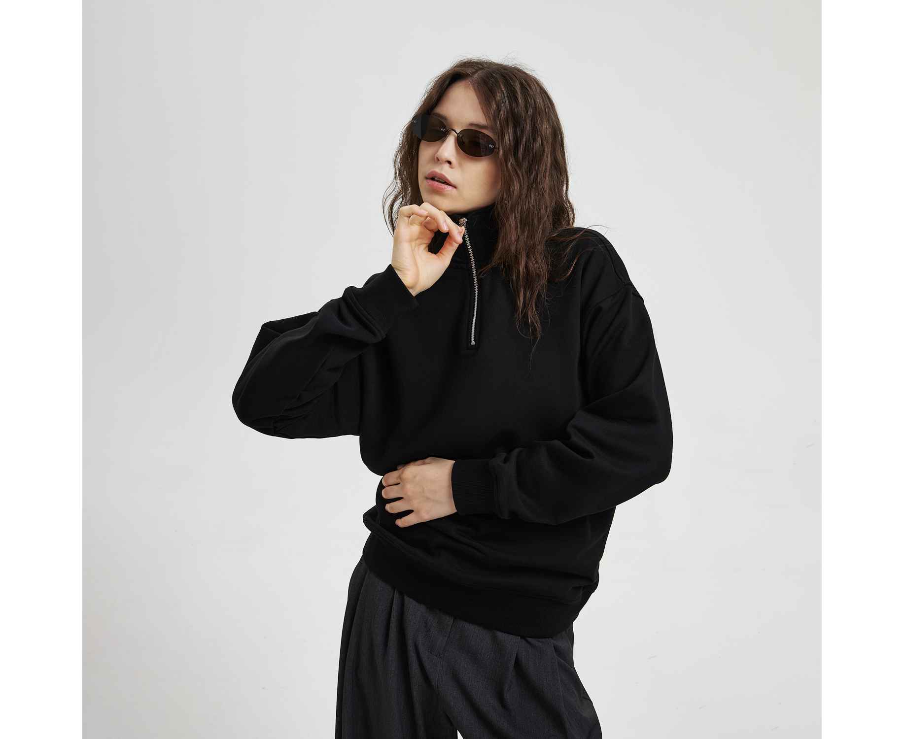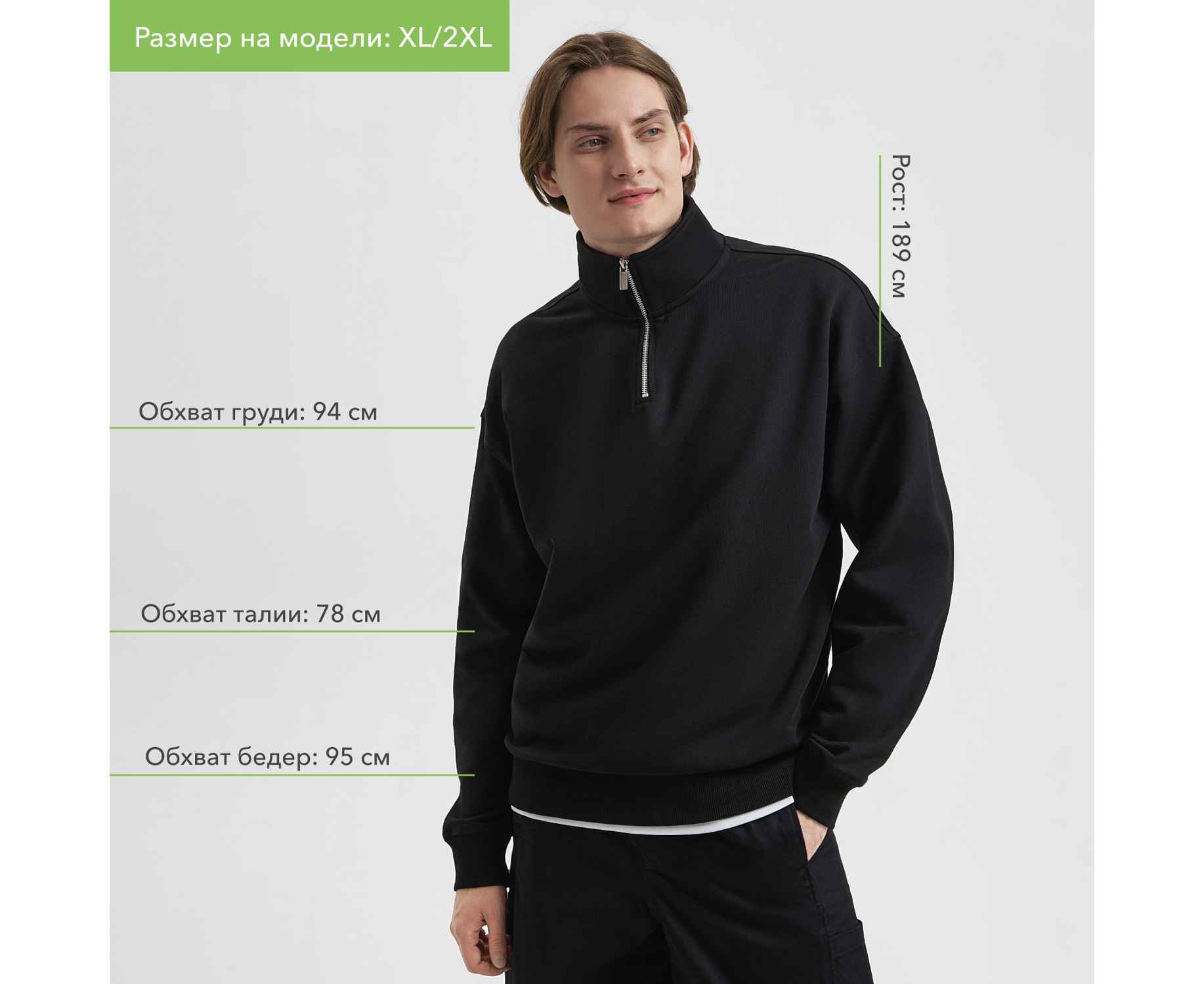 Универсальная толстовка с воротником-стойкой и заниженной линией плеча. По нижнему краю и на рукавах — эластичные резинки для комфортной и аккуратной посадки. Модель застёгивается на металлическую молнию.