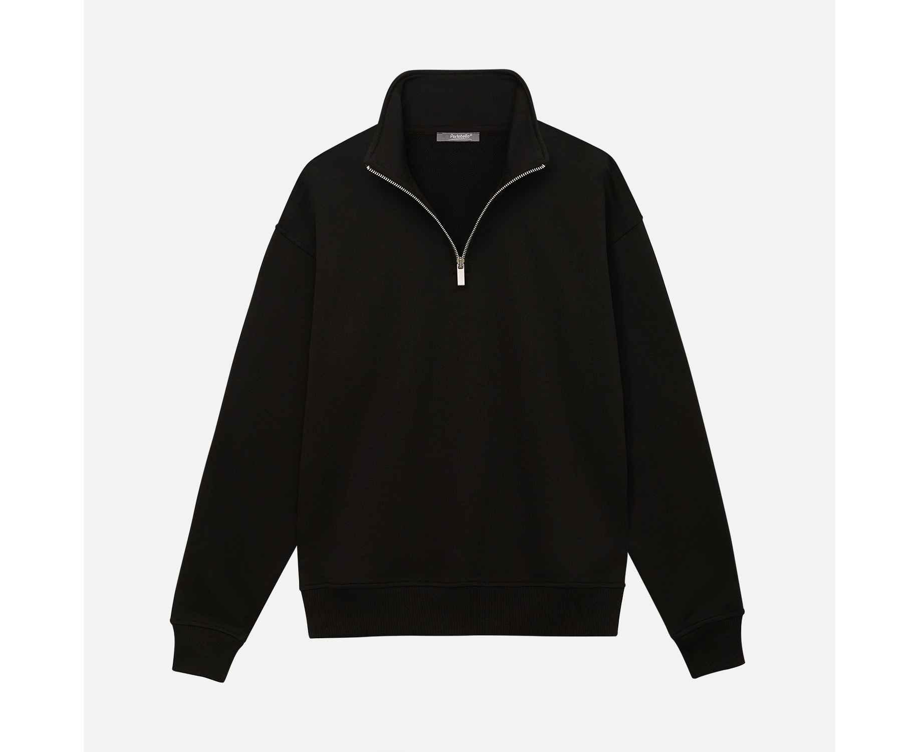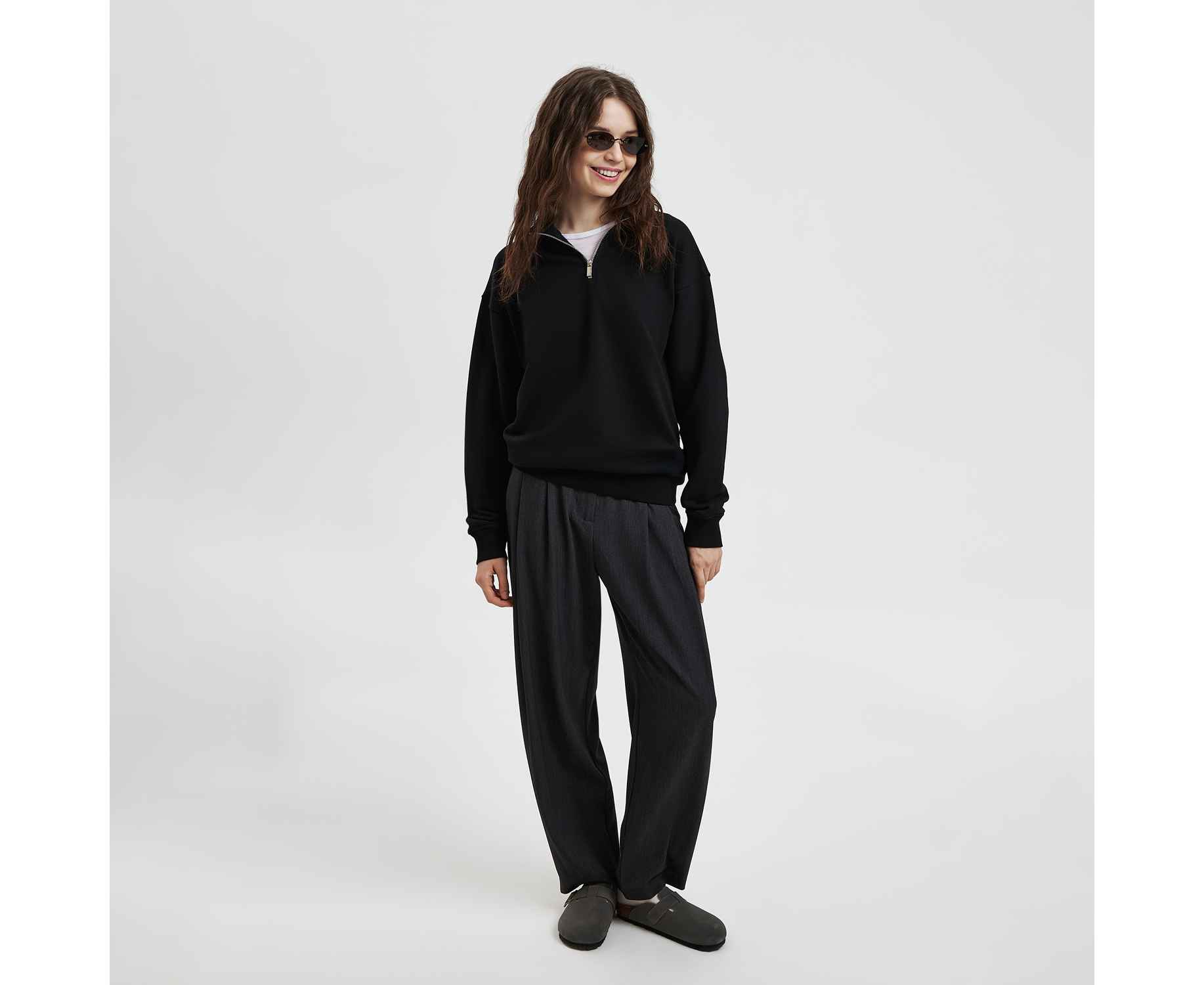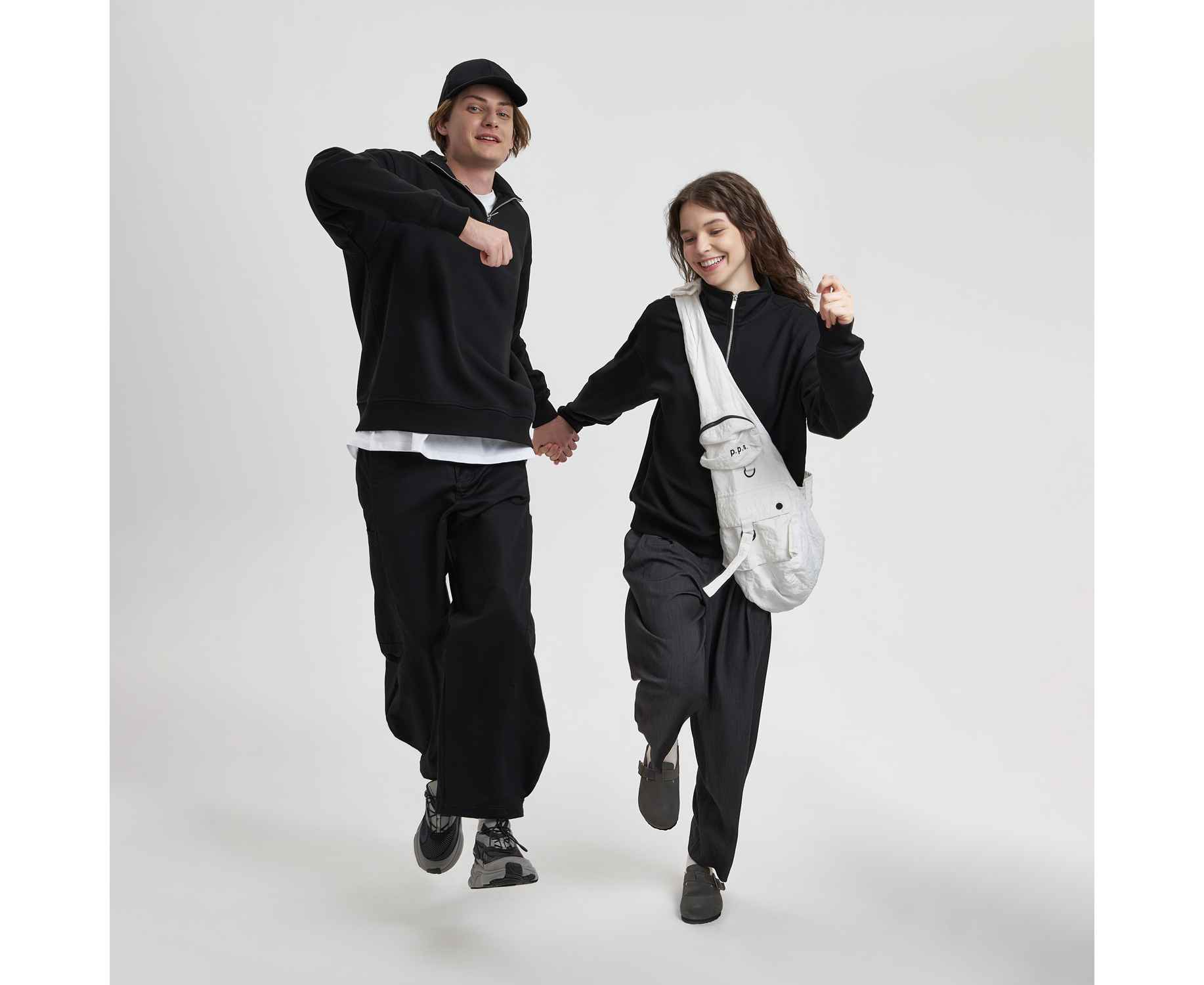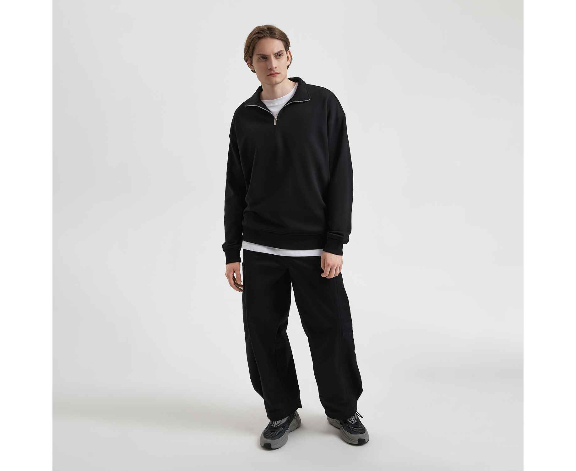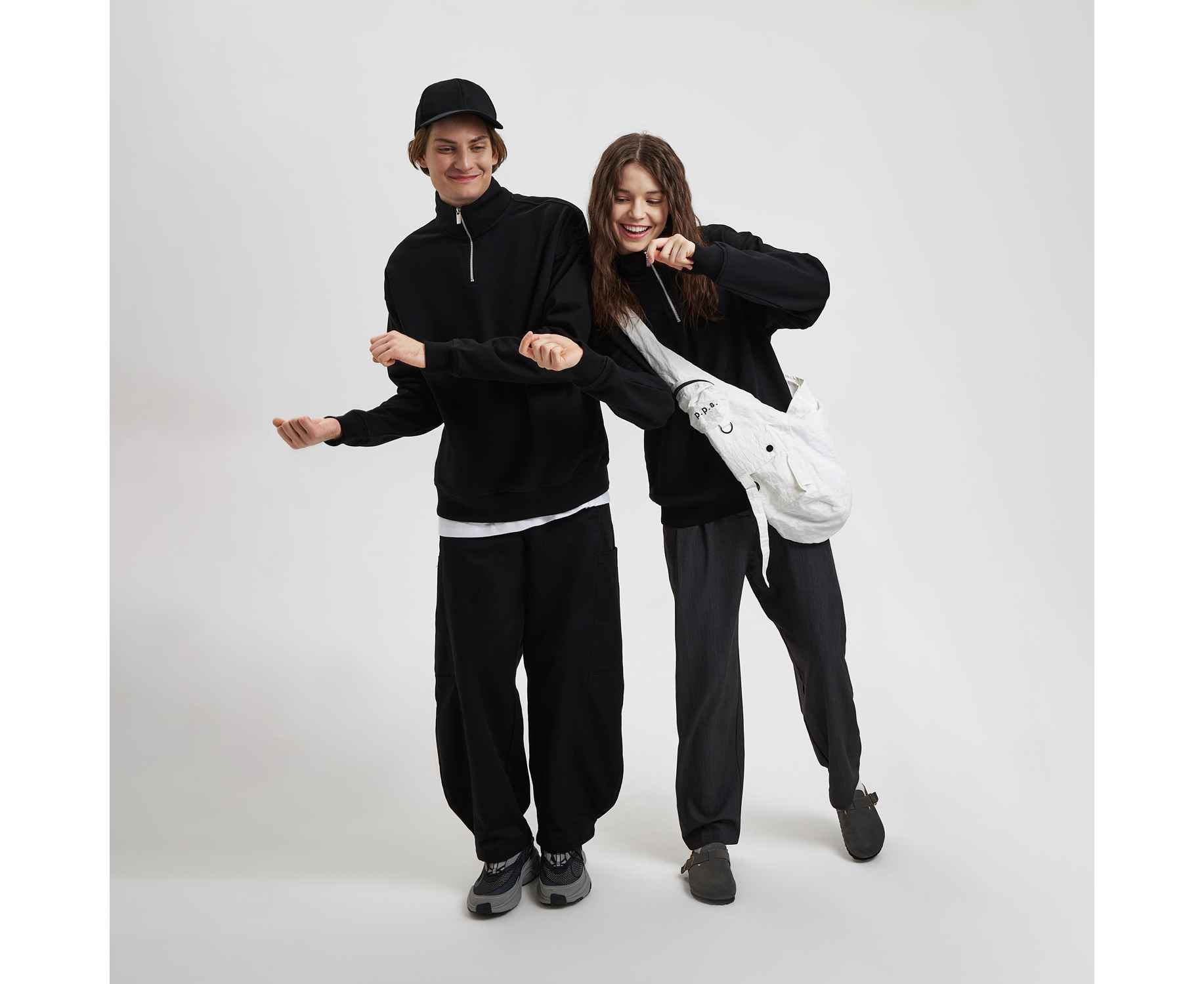 Универсальная толстовка с воротником-стойкой и заниженной линией плеча. По нижнему краю и на рукавах — эластичные резинки для комфортной и аккуратной посадки. Модель застёгивается на металлическую молнию.