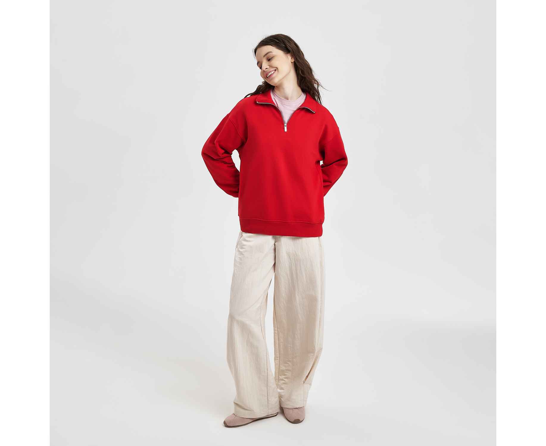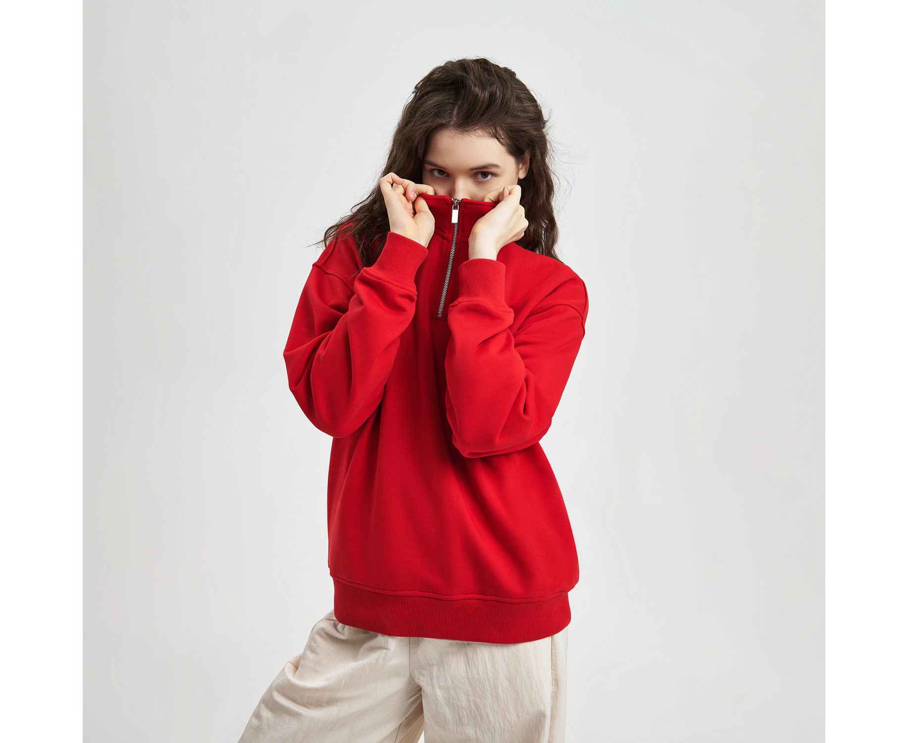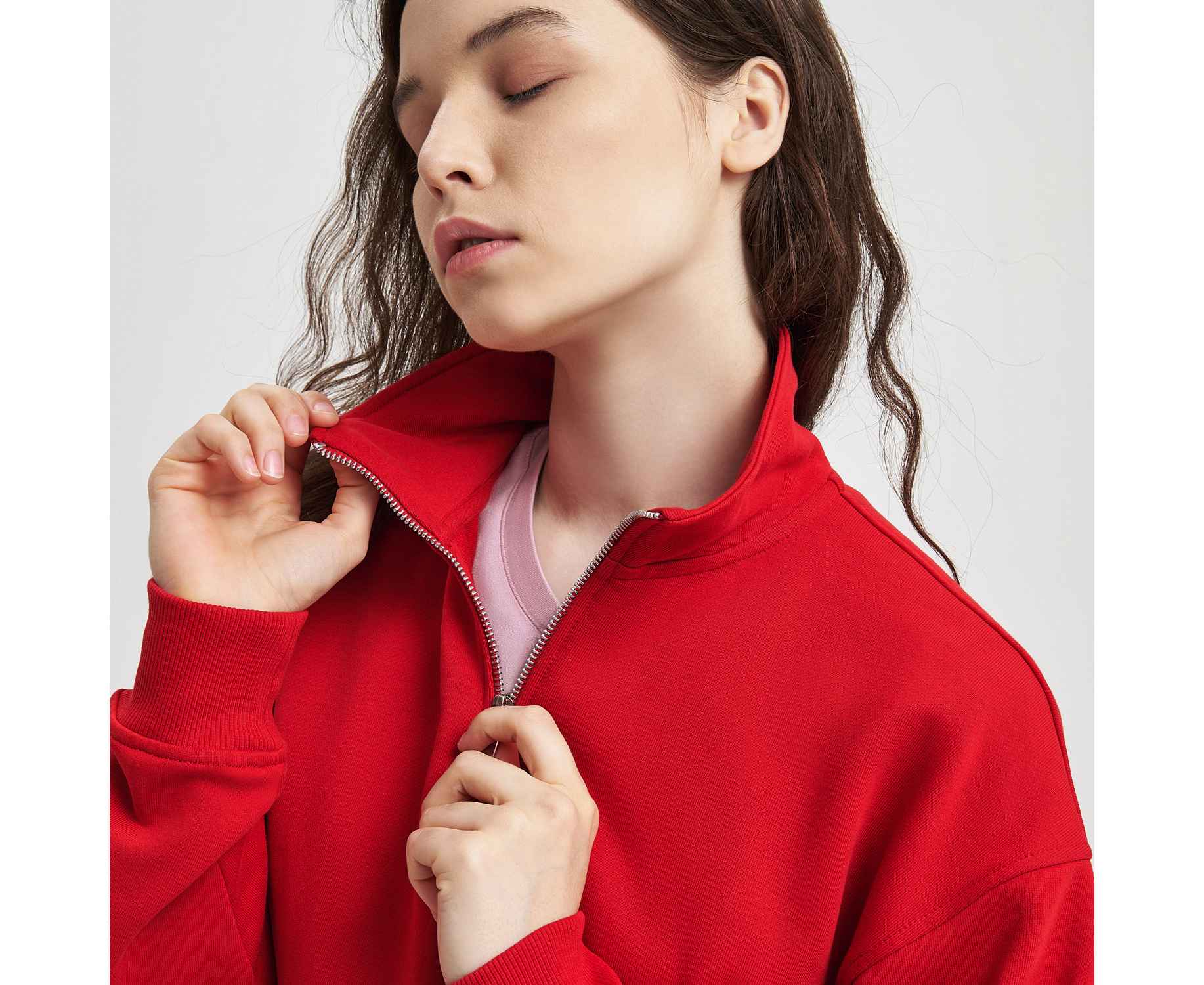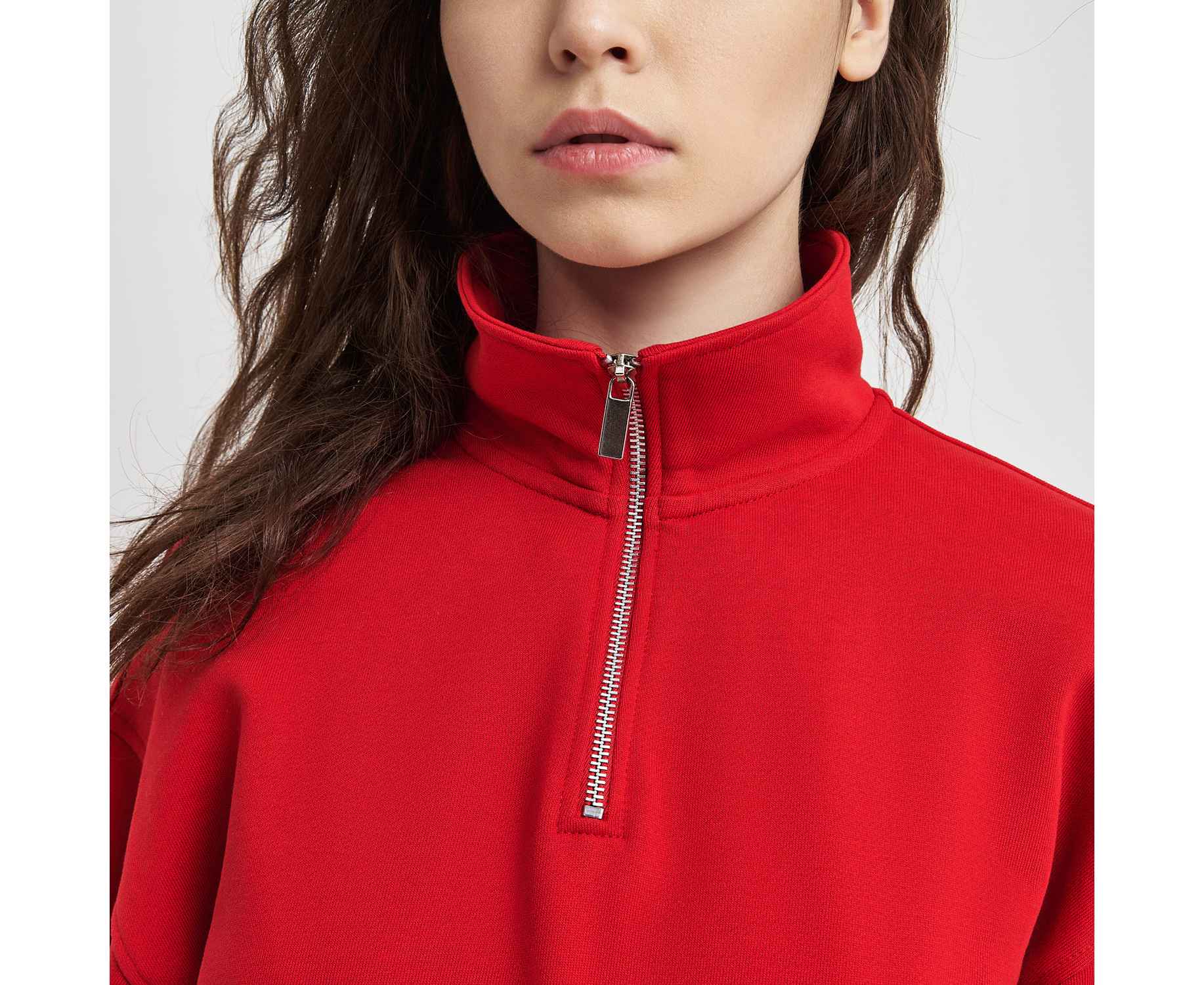 Универсальная толстовка с воротником-стойкой и заниженной линией плеча. По нижнему краю и на рукавах — эластичные резинки для комфортной и аккуратной посадки. Модель застёгивается на металлическую молнию.