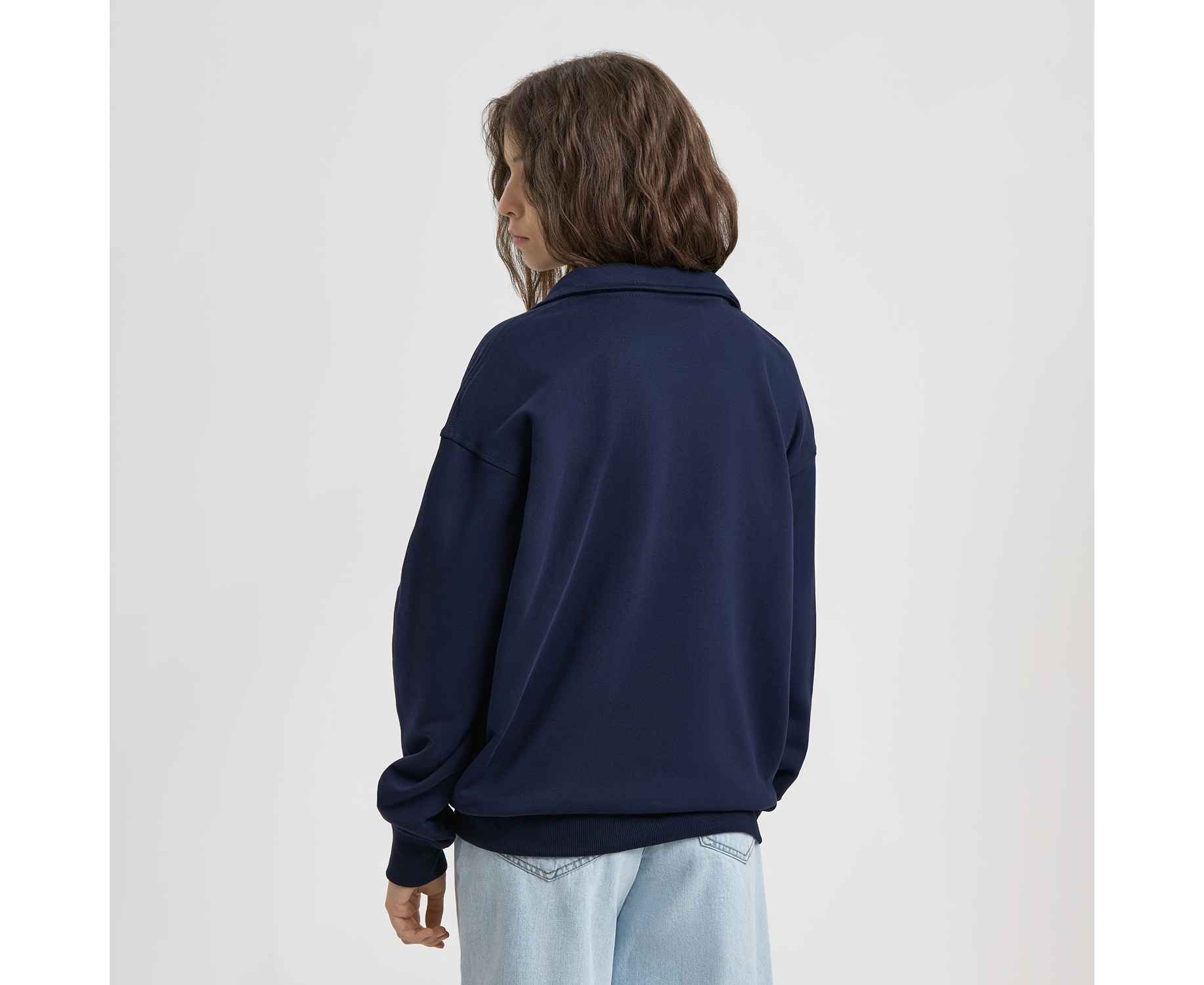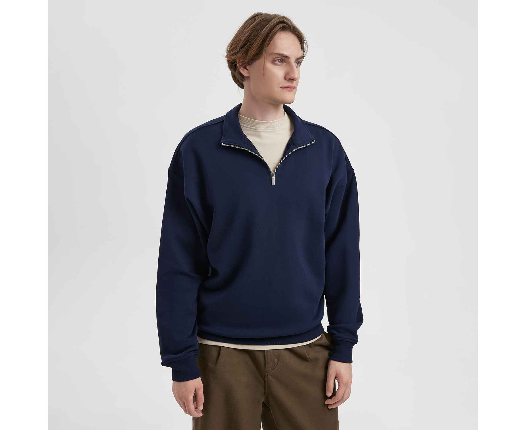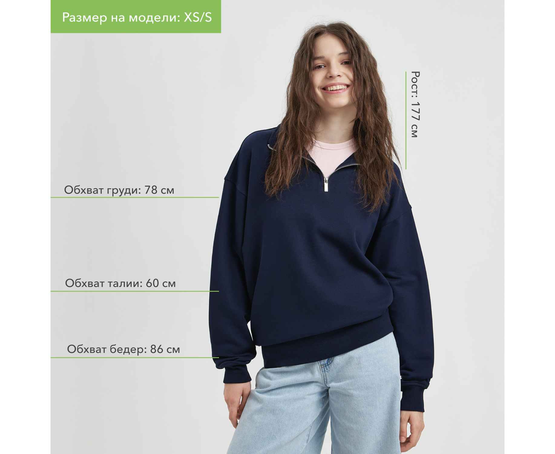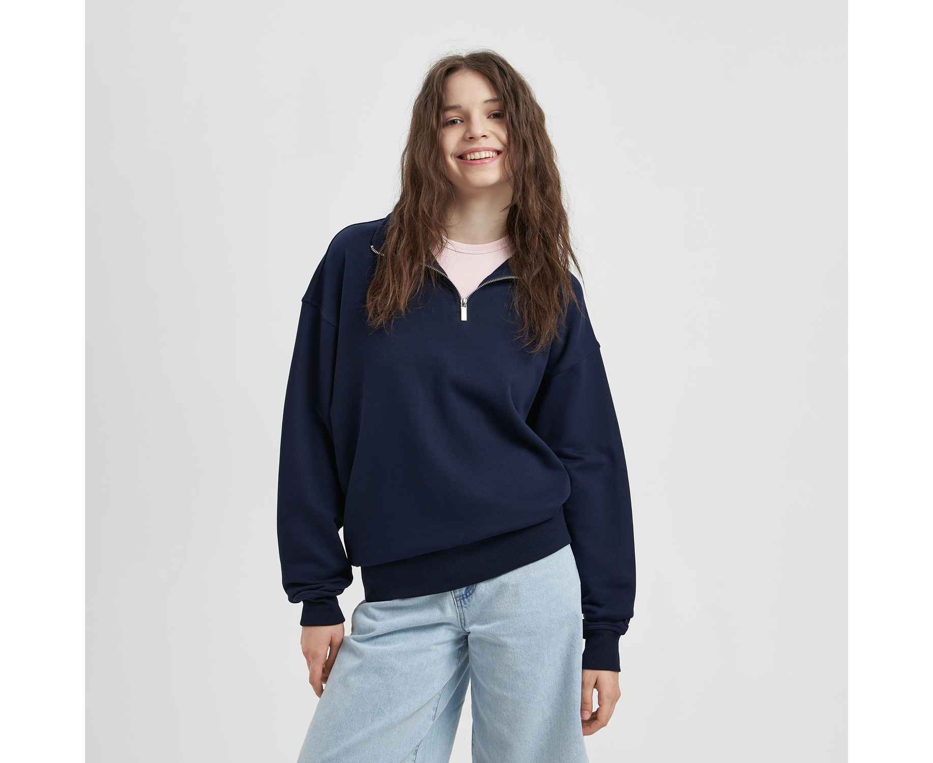 Универсальная толстовка с воротником-стойкой и заниженной линией плеча. По нижнему краю и на рукавах — эластичные резинки для комфортной и аккуратной посадки. Модель застёгивается на металлическую молнию.
