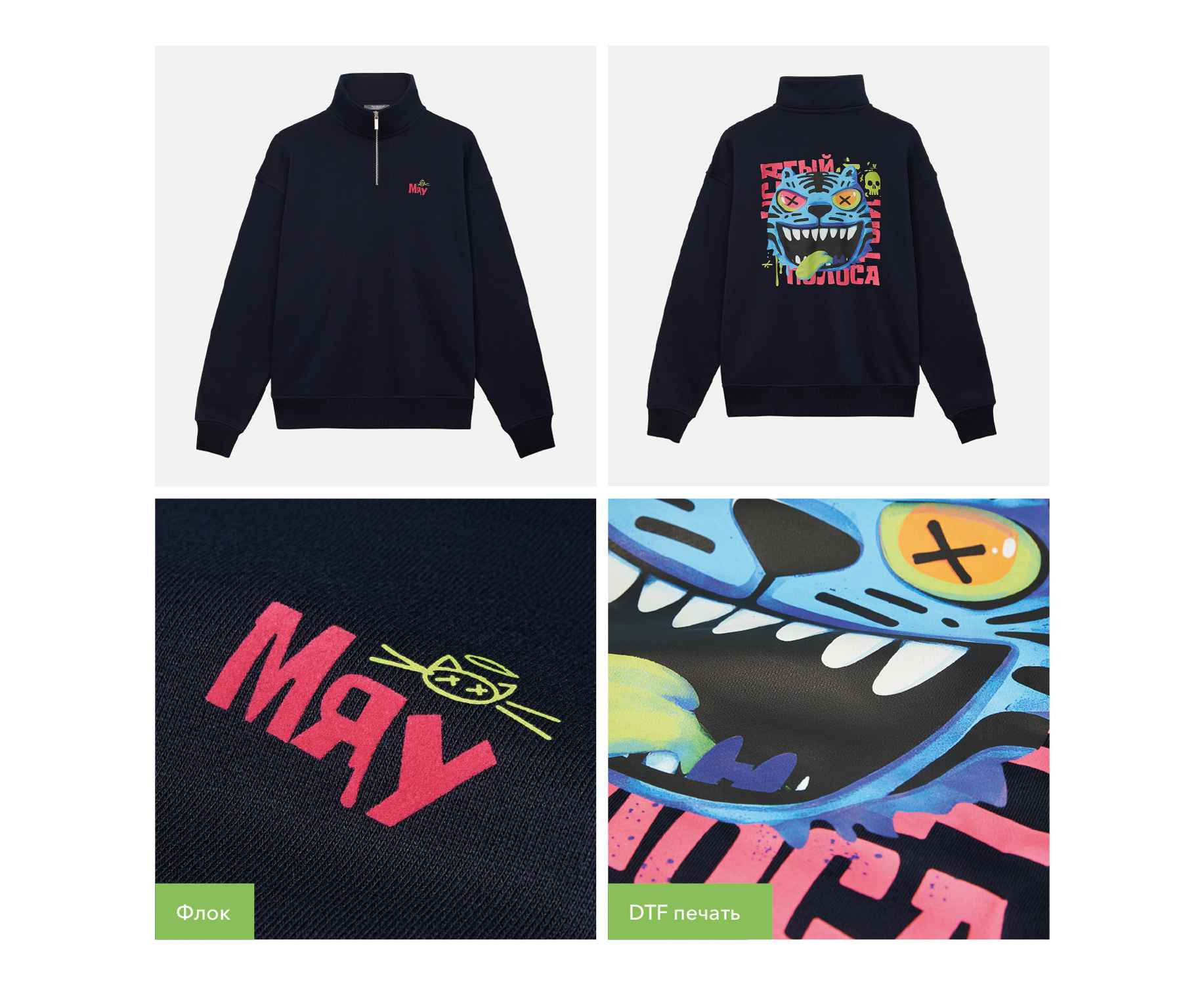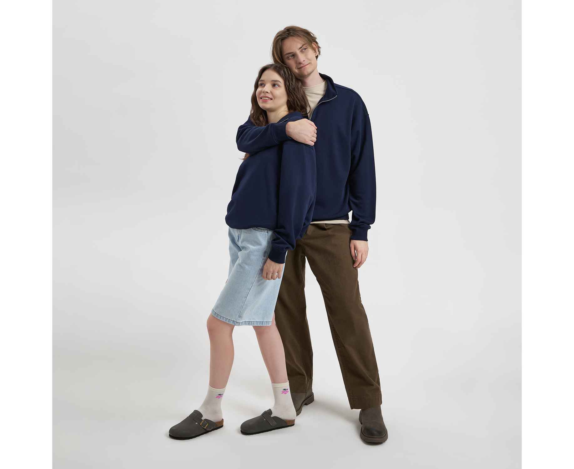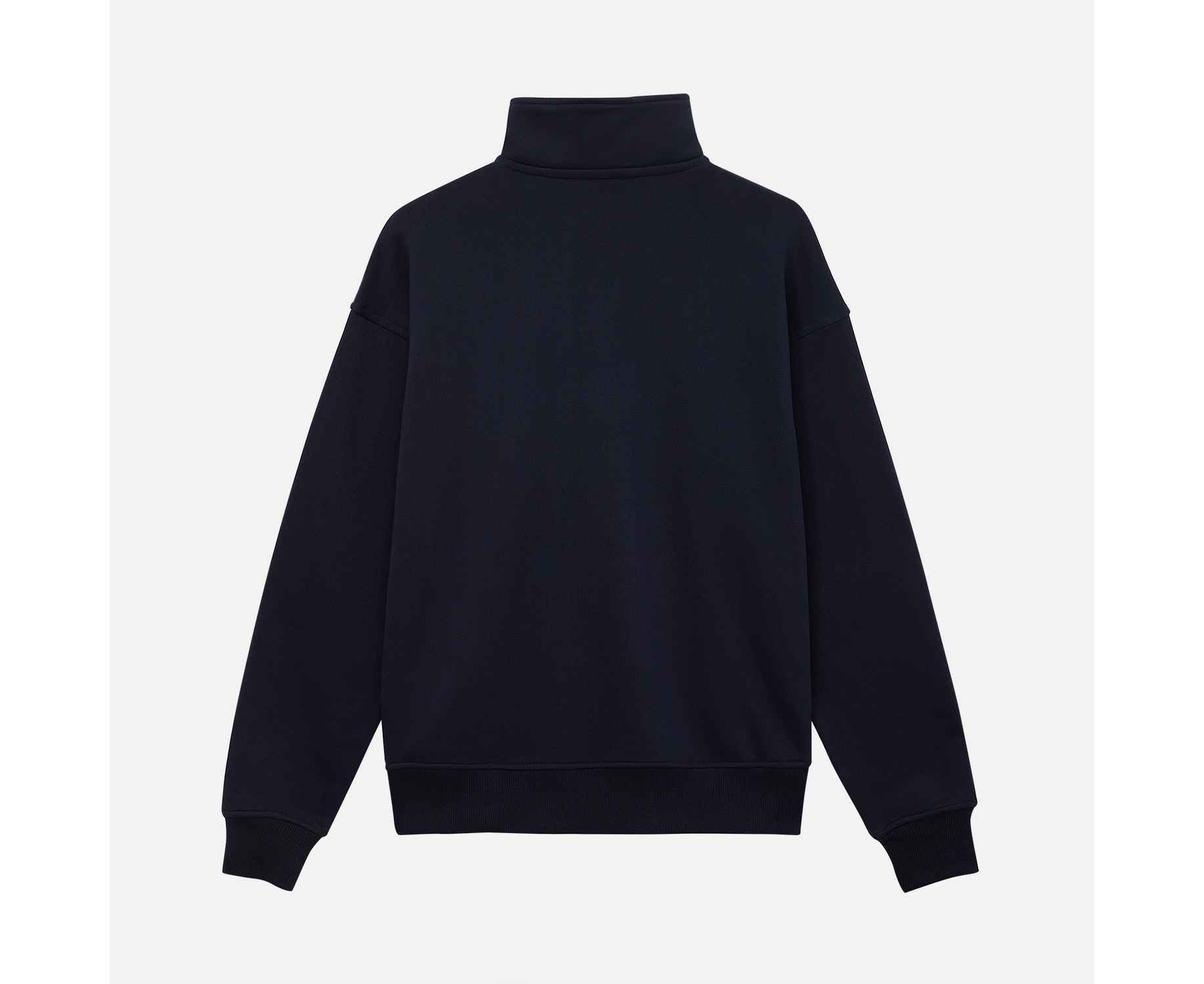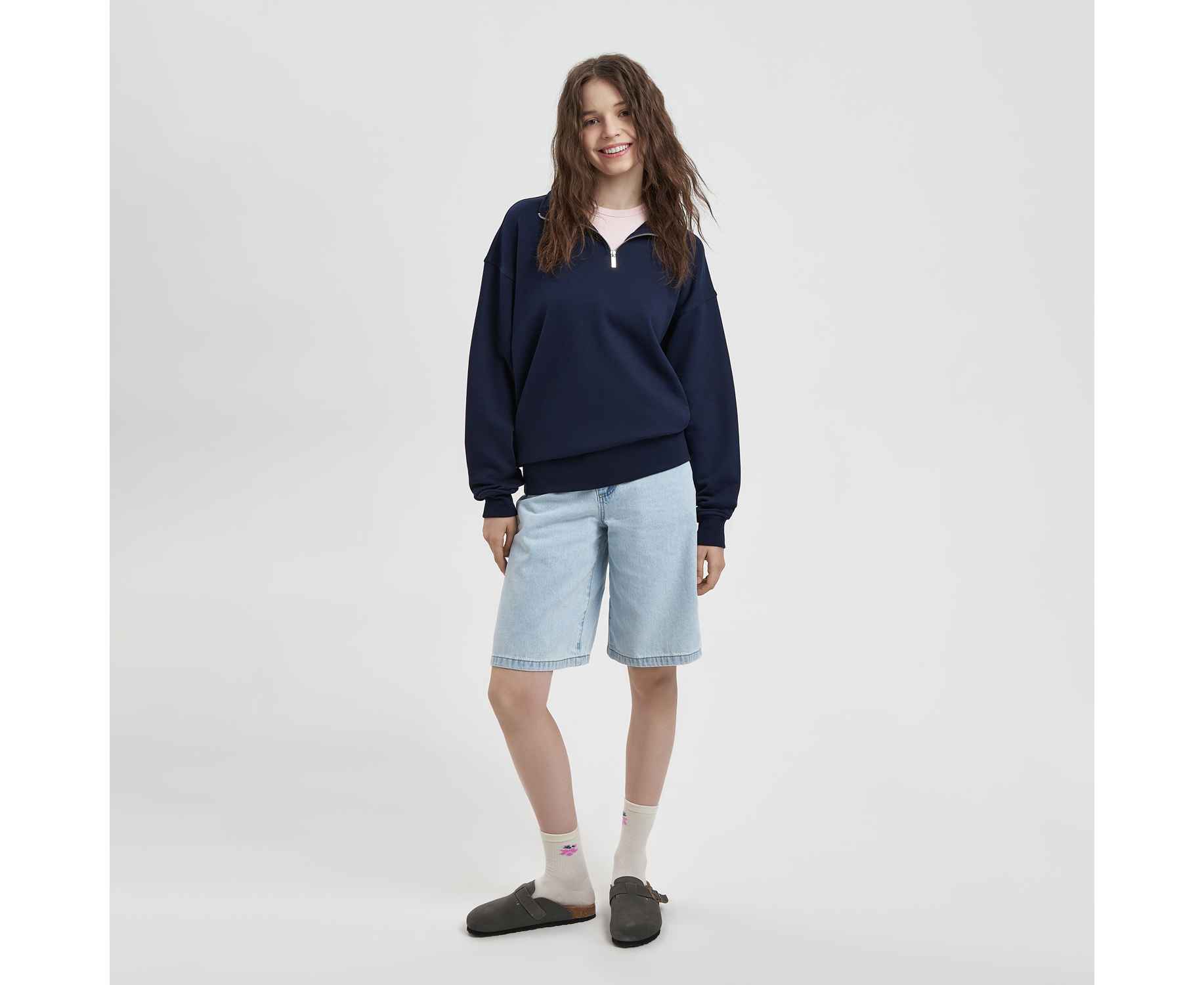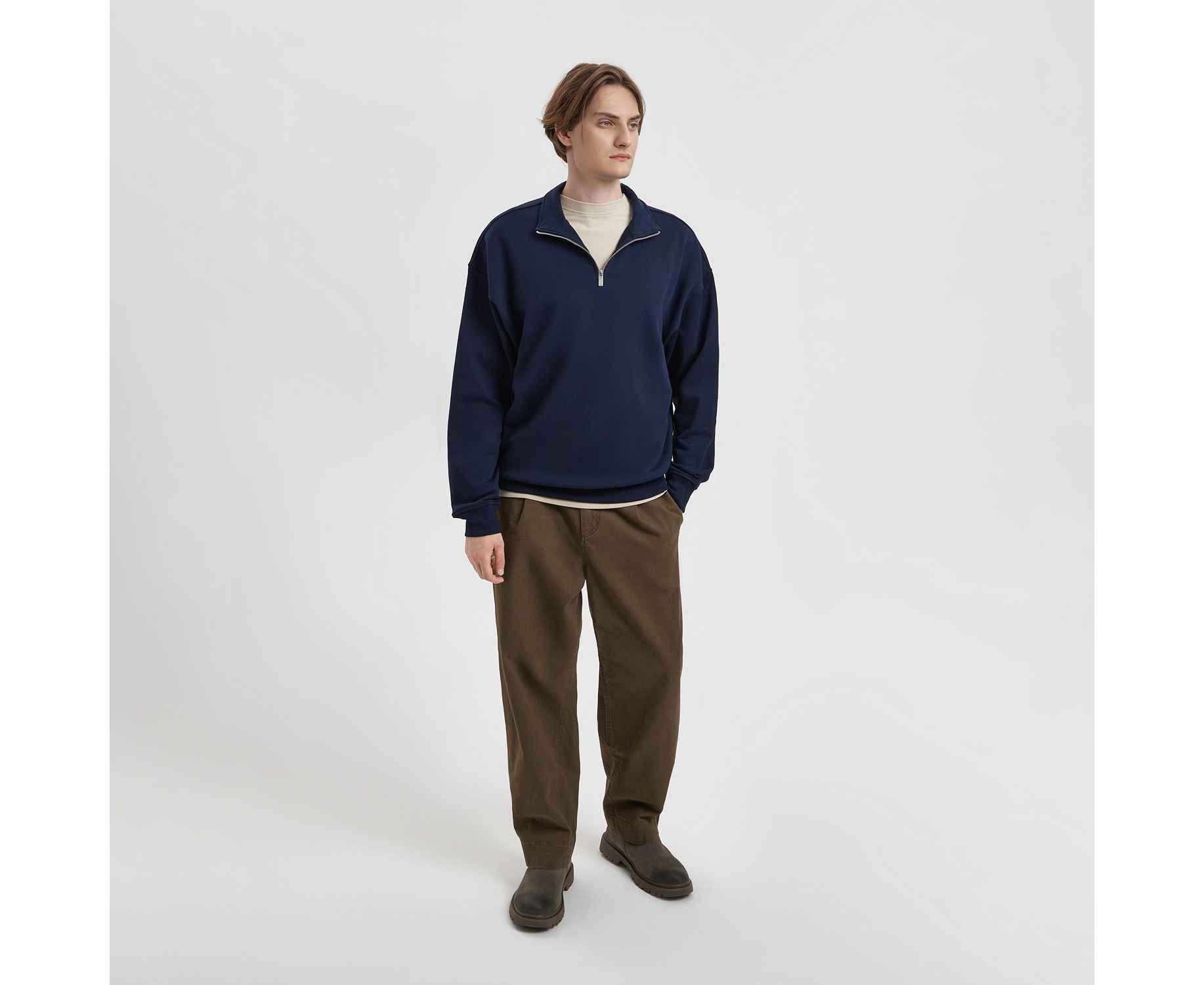 Универсальная толстовка с воротником-стойкой и заниженной линией плеча. По нижнему краю и на рукавах — эластичные резинки для комфортной и аккуратной посадки. Модель застёгивается на металлическую молнию.