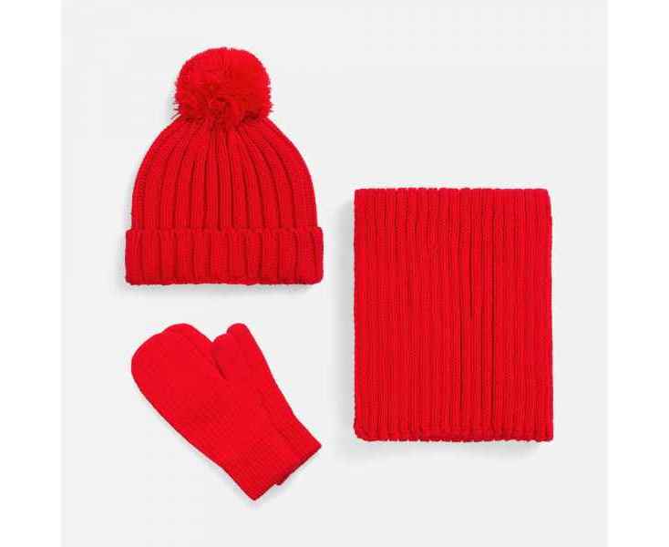 Шапка с пышным помпоном и отворотом, связанная крупной резинкой, создает игривый силуэт, а широкий шарф с выразительной текстурой надежно защищает от ветра, сохраняя свободу движений. Варежки с отворотом-резинкой плотно облегают запястье, не пропуская холод.