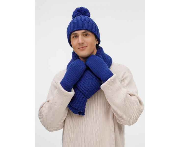 Шапка с пышным помпоном и отворотом, связанная крупной резинкой, создает игривый силуэт, а широкий шарф с выразительной текстурой надежно защищает от ветра, сохраняя свободу движений. Варежки с отворотом-резинкой плотно облегают запястье, не пропуская холод.