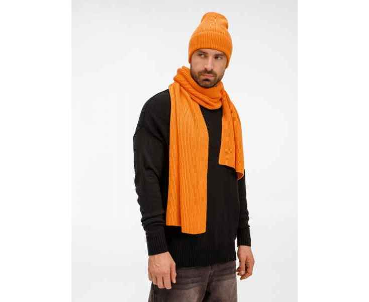 Удлиненная шапка с широким отворотом и фактурной вязкой мягко облегает голову, создавая элегантный силуэт. Широкий шарф с выразительным рельефом позволяет экспериментировать с драпировками, добавляя образу объем и динамику. Перчатки с аккуратной резинкой на манжете обеспечивают идеальную посадку и тактильный комфорт.