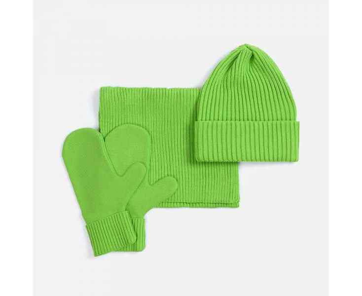 В набор входят удобный шарф с технологичным отверстием для быстрого завязывания, шапка с двойным отворотом и теплые двухслойные варежки с широкой манжетой. Все изделия связаны из акриловой пряжи, отличаются практичностью и элегантной простотой.