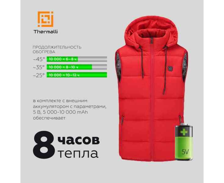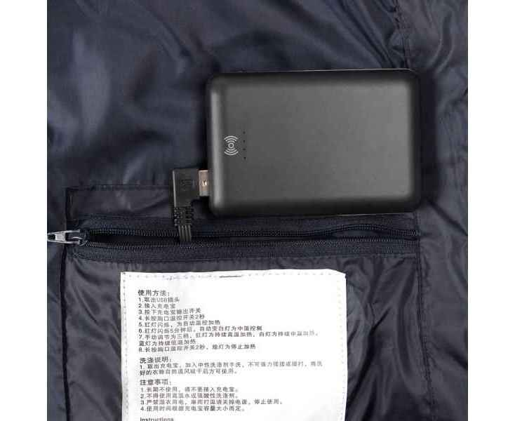 Жилет со встроенным нагревательным элементом из углеродного волокна с девятью зонами нагрева в области спины, шеи и живота. Работает от внешнего аккумулятора (в комплект не входит), подарит ощущение тепла и комфорта в любую погоду.