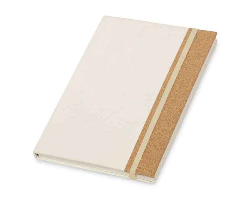 Внешняя обложка блокнота изготовлена из переработанных молочных пакетов (тетра-паков) с вставкой из пробки, а внутренняя крафтовая обложка дополнена линейкой.