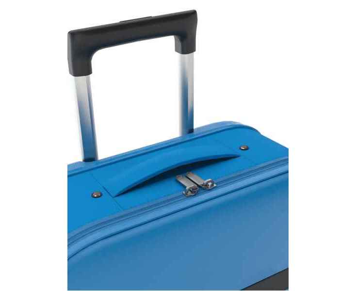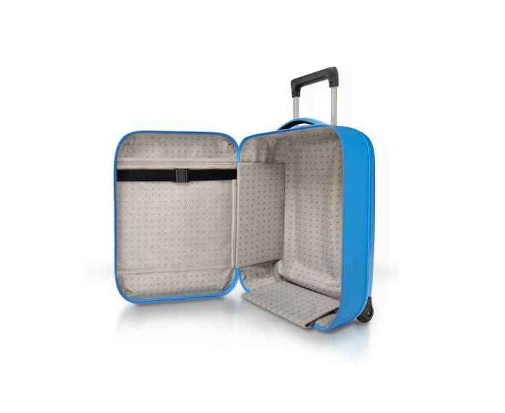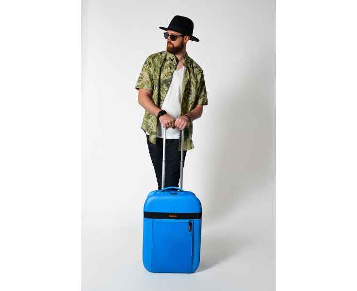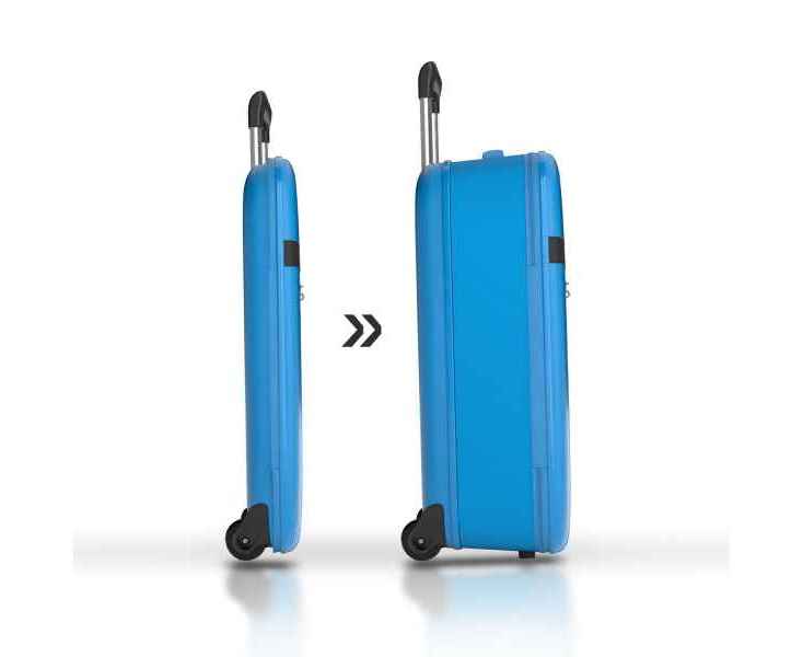 Складной легкий чемодан Rollink Aura ярко-синего цвета. Размер 55х40х20 см. В сложенном виде толщина составляет 8,5 см, с колёсами 10,5 см. Объем 40 л. Вес 2,5 кг. Жесткие стенки сделаны из поликарбоната повышенной ударопрочности. Бока мягкие, из плотного нейлона с высокой водоотталкивающей способностью и высококачественной молнией в цвет чемодана. Чемодан уверенно стоит вертикально даже в сложенном состоянии. Внутри три откидывающихся жестких клапана на дне и боках чемодана, крепятся липучками и сохраняют форму чемодана в собранном виде. Внутри чемодана эластичная Х-образная стяжка для фиксации предметов и большой сетчатый карман на молнии. На передней стенке чемодана расположен большой easy access карман 24х34 см на водозащищенной молнии с несколькими отделениями для ноутбука, документов и мелочей. Удлиненная надежная выдвижная телескопическая ручка из алюминия с несколькими уровнями фиксации высоты ручки (от пола 86/97/107 см) для людей разного роста и удобная мягкая ручка сверху чемодана, чтобы было удобно нести его в руках. 2 колеса со специальным покрытием и подшипниками для более плавного и бесшумного передвижения. Вшитая эластичная стяжка с магнитной пряжкой фиксирует чемодан в сложенном состоянии. Упакован в индивидуальную белую картонную коробку 58х42х11 см с ручкой.