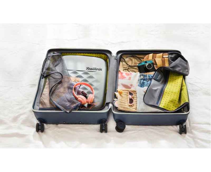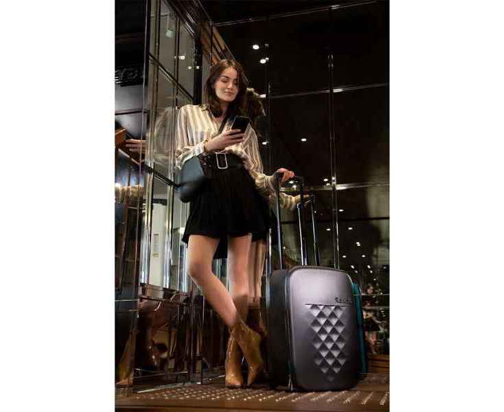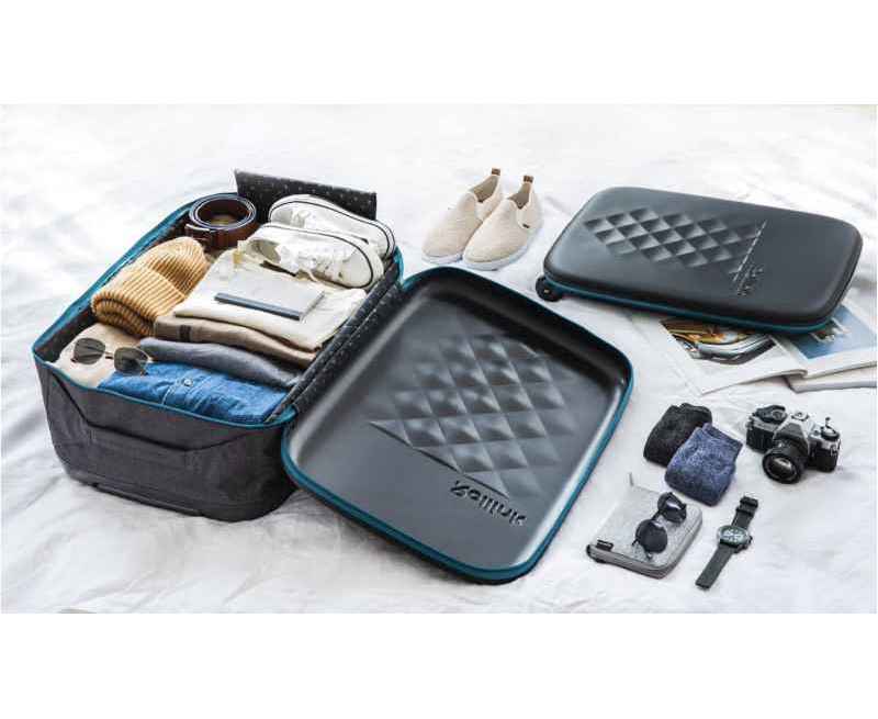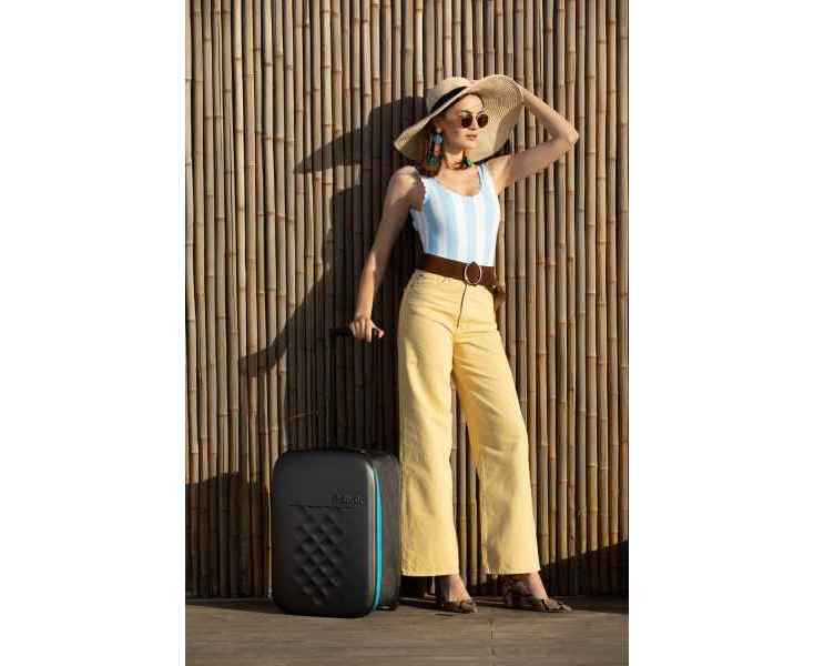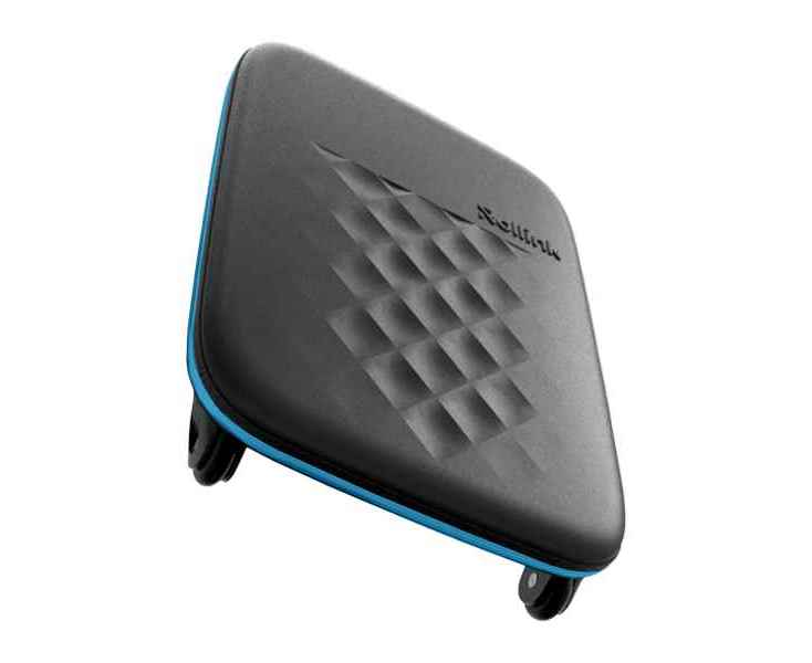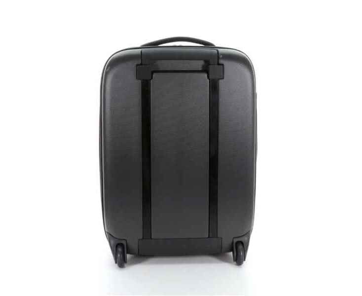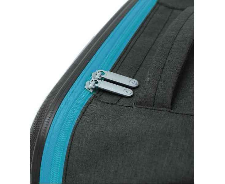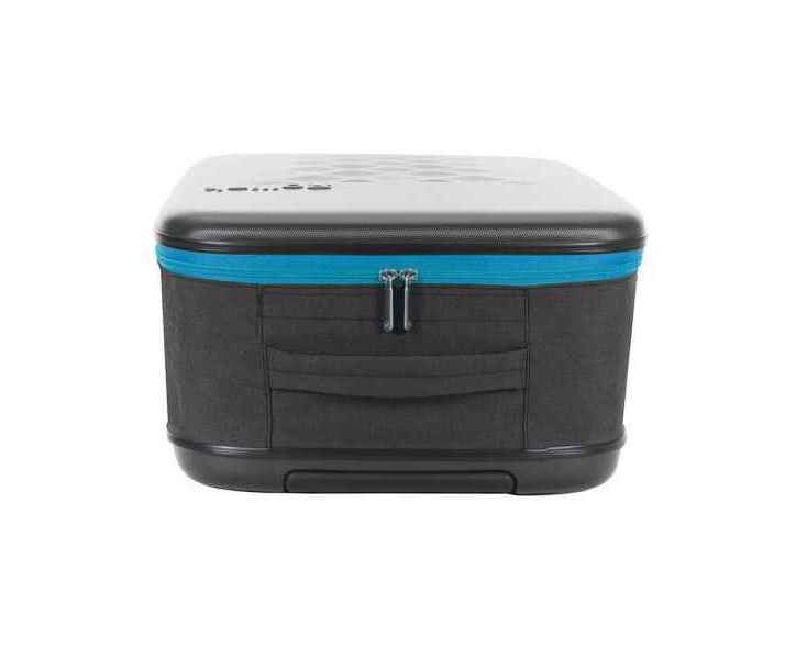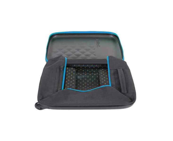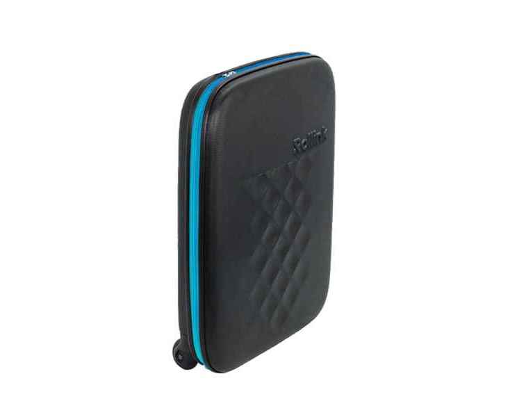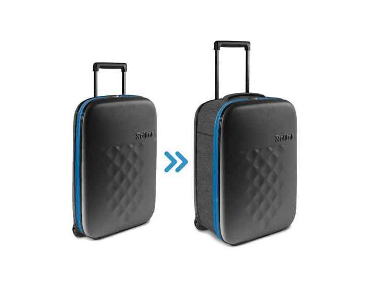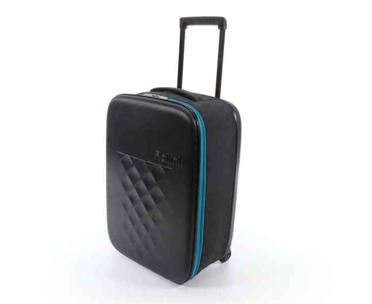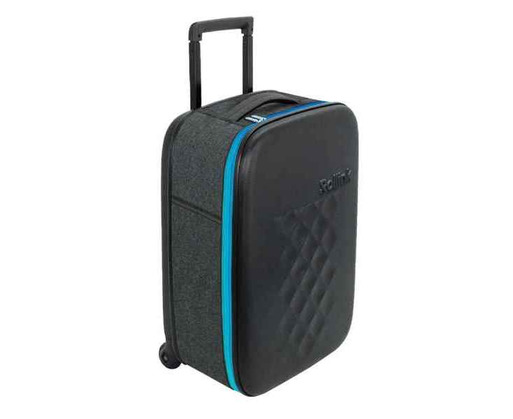 Складной легкий чемодан Rollink Earth черного цвета с синей молнией. Размер 55х40х20 см. В сложенном виде толщина составляет 5 см, с колёсами 8,5 см. Объем 40 л. Вес 2,2 кг. Жесткие стенки сделаны из ударопрочного полипропилена. Бока мягкие, из полиэстера с водоотталкивающей пропиткой. Внутри два откидывающихся жестких клапана на дне и вверху чемодана, крепятся липучками и сохраняют форму чемодана в собранном виде. Боковой easy access карман 12х19 см на липучке для документов и телефона. Удлиненная надежная выдвижная телескопическая ручка из алюминия с несколькими уровнями фиксации высоты ручки (от пола 80/94/104 см) для людей разного роста и удобная мягкая ручка сверху чемодана, чтобы было удобно нести его в руках. 2 колеса со специальным покрытием и подшипниками для более плавного и бесшумного передвижения. Надежная молния синего цвета.
