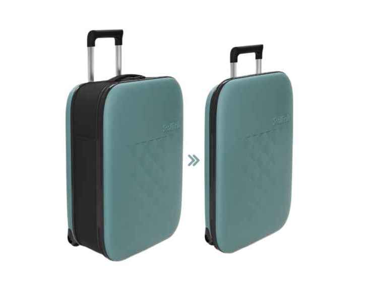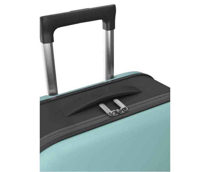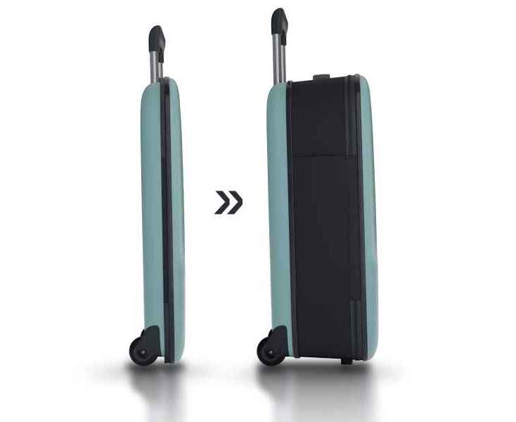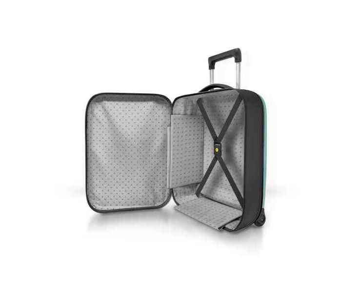 Складной легкий чемодан Rollink Vega II бирюзового цвета. Размер 55х40х20 см. В сложенном виде толщина составляет 5 см, с колёсами 8,5 см. Объем 40 л. Вес 2,4 кг. Жесткие стенки сделаны из поликарбоната повышенной ударопрочности. Бока мягкие, из темно-серого плотного полиэстера с высокой водоотталкивающей способностью. Чемодан уверенно стоит вертикально даже в сложенном состоянии. Внутри три откидывающихся жестких клапана на дне и боках чемодана, крепятся липучками и сохраняют форму чемодана в собранном виде. Эластичная Х-образная стяжка для фиксации предметов внутри чемодана. Боковой easy access карман 12х18,5 см на липучке для документов и телефона. Удлиненная надежная выдвижная телескопическая ручка из алюминия с несколькими уровнями фиксации высоты ручки (от пола 88/96/104 см) для людей разного роста и удобная мягкая ручка сверху чемодана, чтобы было удобно нести его в руках. 2 колеса со специальным покрытием и подшипниками для более плавного и бесшумного передвижения. Высококачественная молния черного цвета. В комплект входит эластичная стяжка для фиксации чемодана в сложенном состоянии.