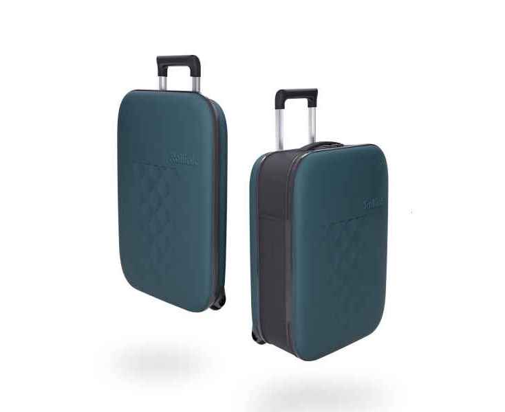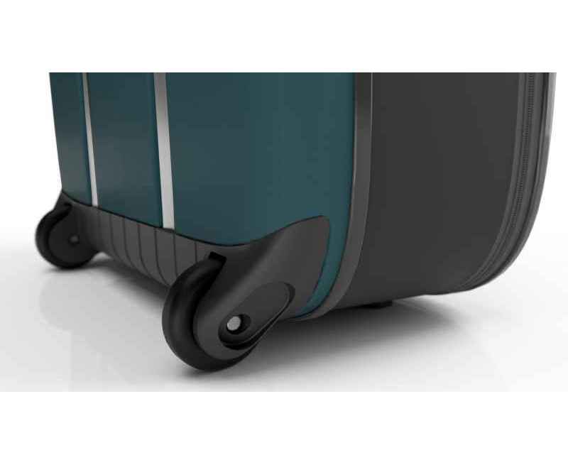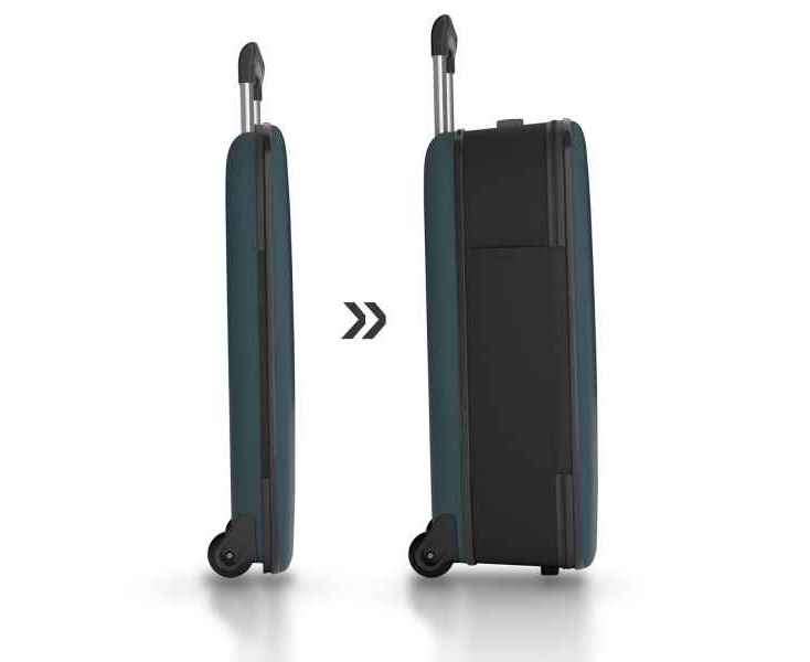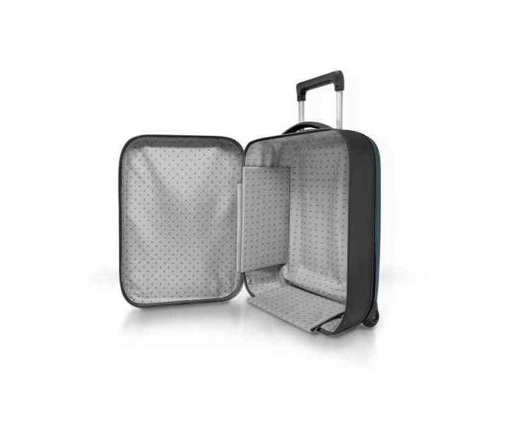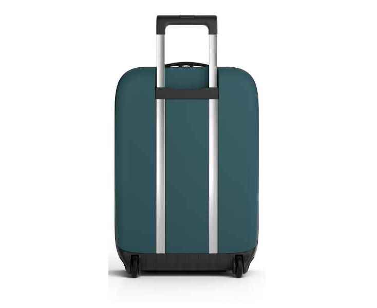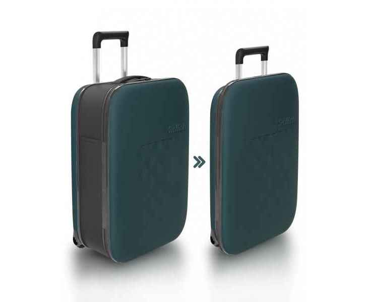 Складной легкий чемодан Rollink Vega II сине-зеленого цвета Deep Lagoon. Размер 55х40х20 см. В сложенном виде толщина составляет 5 см, с колёсами 8,5 см. Объем 40 л. Вес 2,4 кг. Жесткие стенки сделаны из поликарбоната повышенной ударопрочности. Бока мягкие, из темно-серого плотного полиэстера с высокой водоотталкивающей способностью. Чемодан уверенно стоит вертикально даже в сложенном состоянии. Внутри три откидывающихся жестких клапана на дне и боках чемодана, крепятся липучками и сохраняют форму чемодана в собранном виде. Эластичная Х-образная стяжка для фиксации предметов внутри чемодана. Боковой easy access карман 12х18,5 см на липучке для документов и телефона. Удлиненная надежная выдвижная телескопическая ручка из алюминия с несколькими уровнями фиксации высоты ручки (от пола 88/96/104 см) для людей разного роста и удобная мягкая ручка сверху чемодана, чтобы было удобно нести его в руках. 2 колеса со специальным покрытием и подшипниками для более плавного и бесшумного передвижения. Высококачественная молния черного цвета. В комплект входит эластичная стяжка для фиксации чемодана в сложенном состоянии.